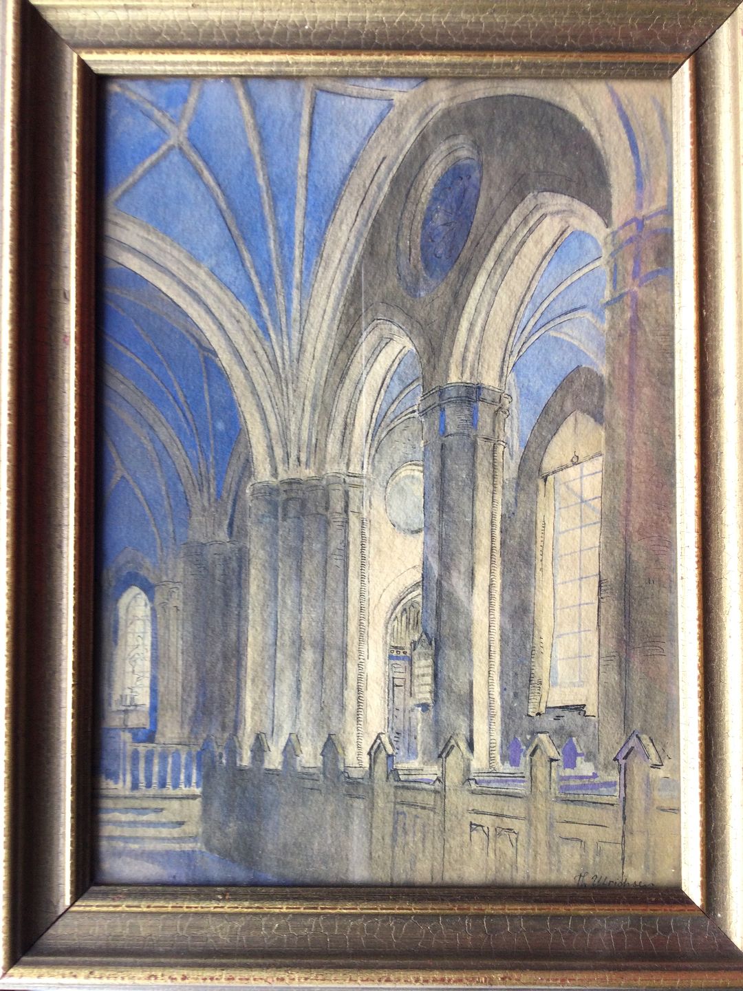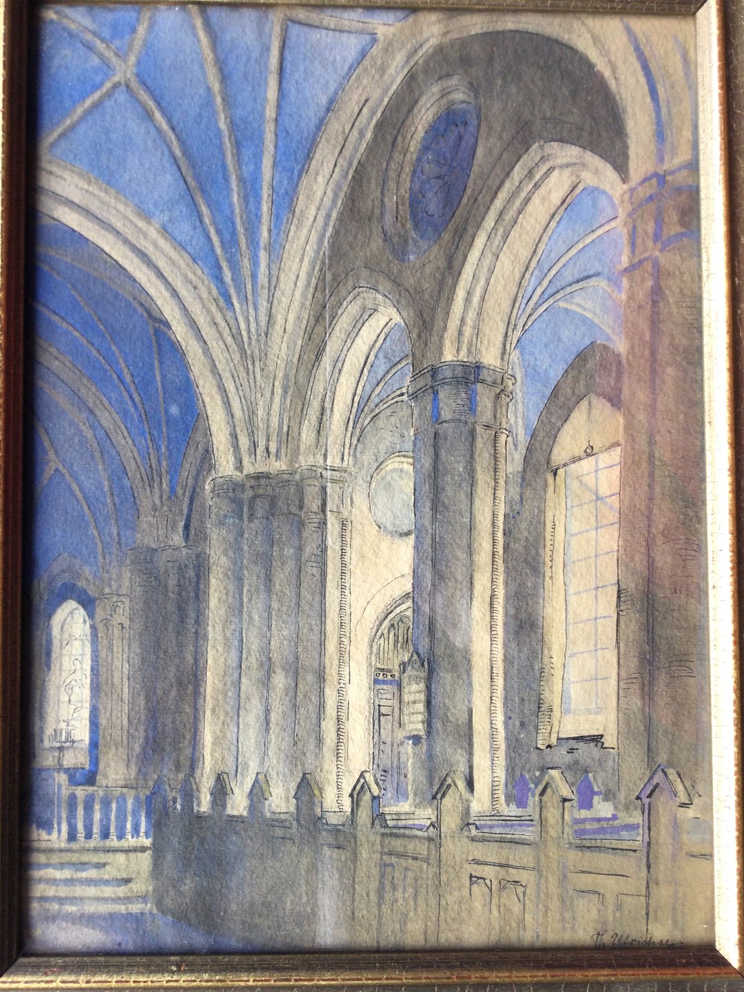 Akvarel af Theodor Ulrichsen - Interiør fra kirke.