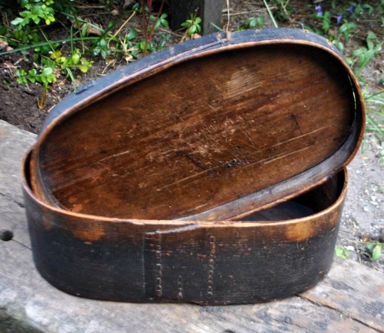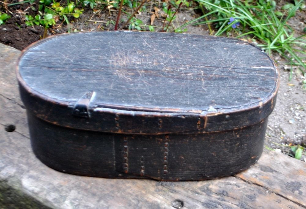 Antik håndbemalet spån hatteæske, 19. årh. Danmark. Oval. Brunmalet fyrretræ. Udvendig forsynet med læder beslag. L.: 52 cm.. B.: 32 cm. H.: 20 cm.