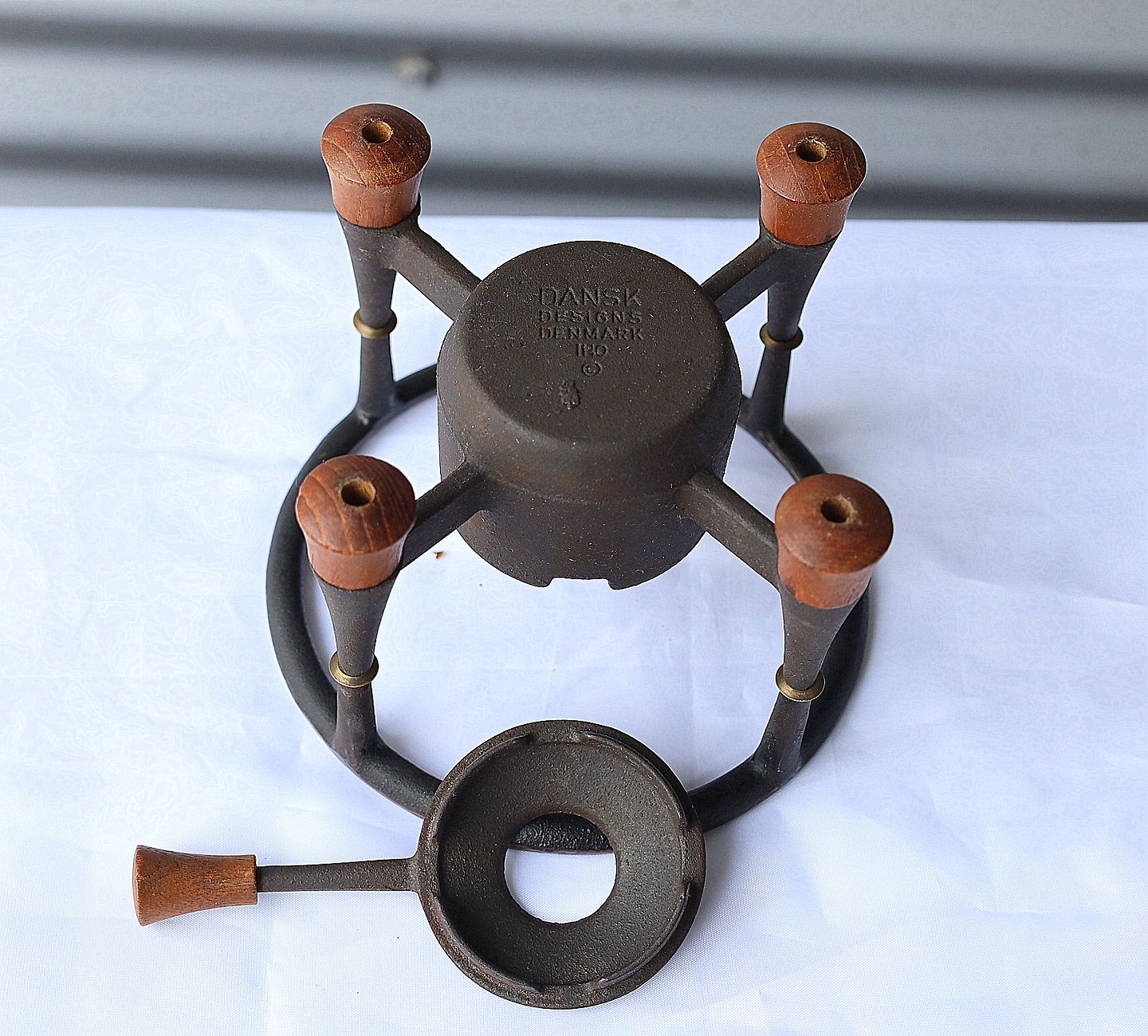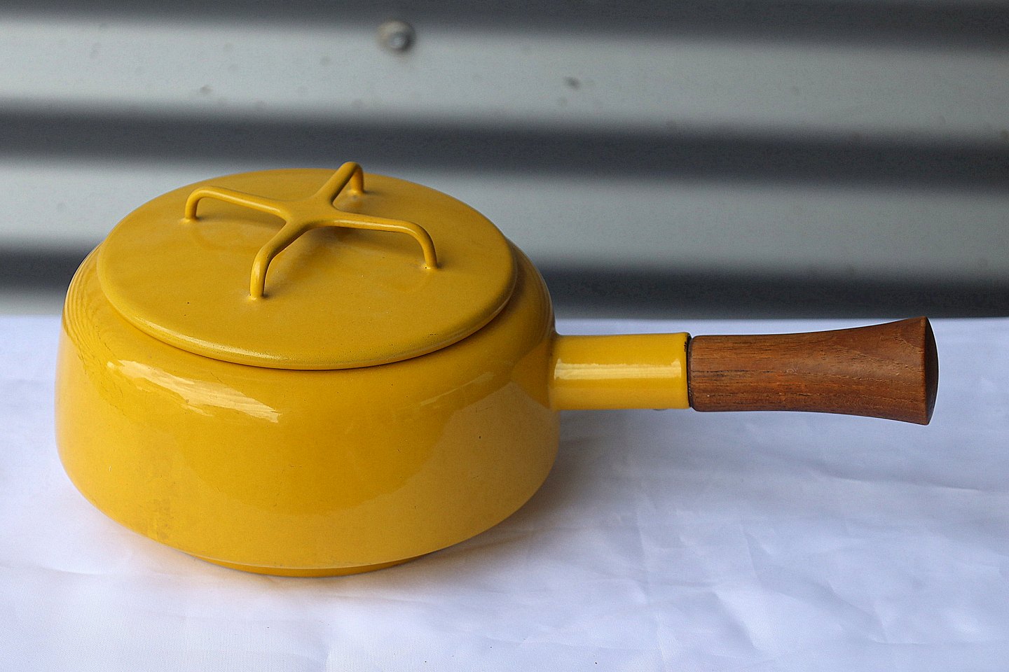Text available in Danish: IHQ = Jens Harald Quistgaard. Gul fonduegryde med brænder. Gryde "France". Gryden er gul emaljeret jern og brænderen er støbejern. Fondue sættet bliver kaldet " Kobenstyle". Fondue sættet kommer med gryde med teaktræ håndtag, og brænder med låg med teaktræ håndtag og fødder af teaktræ.