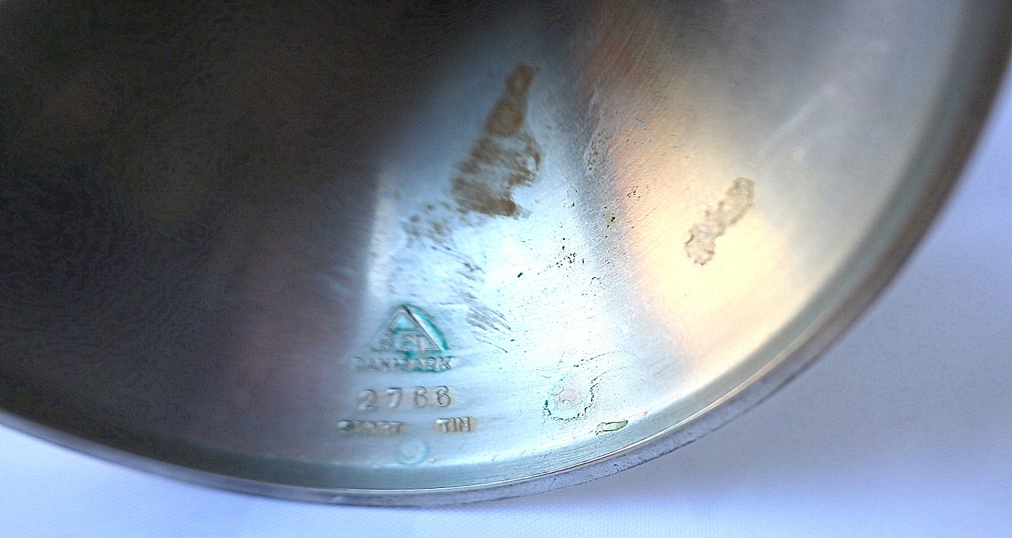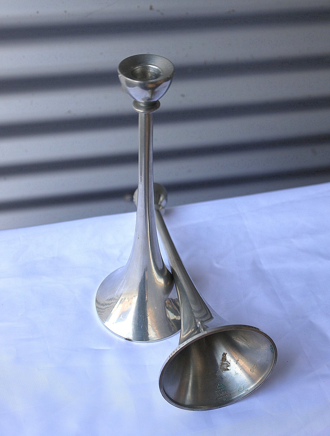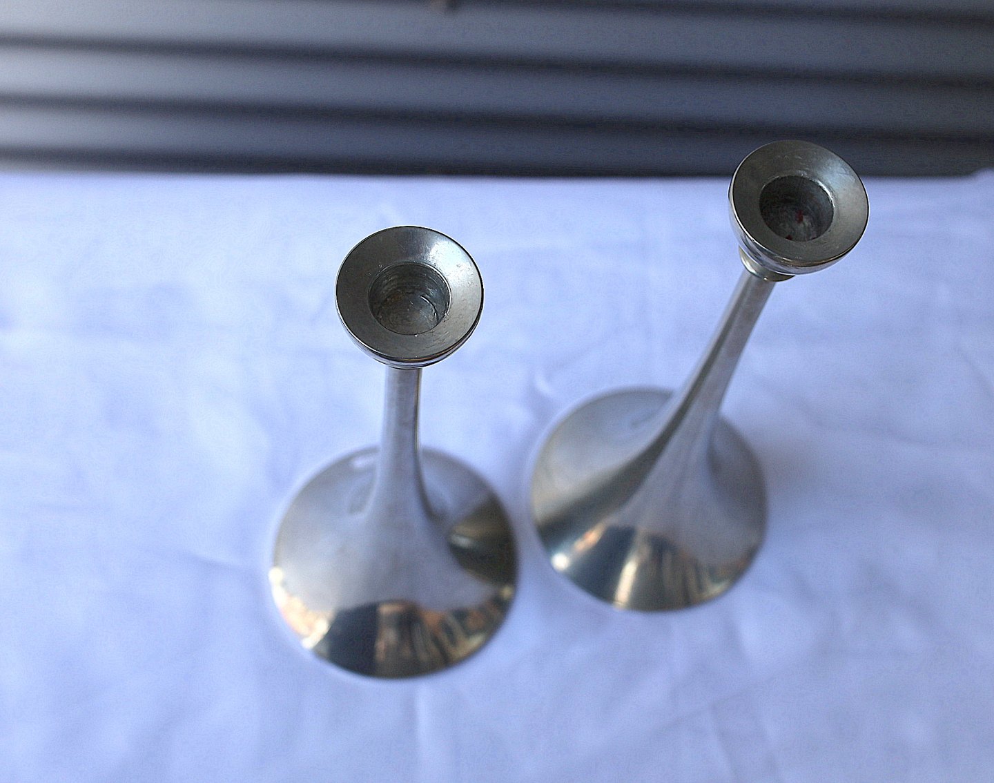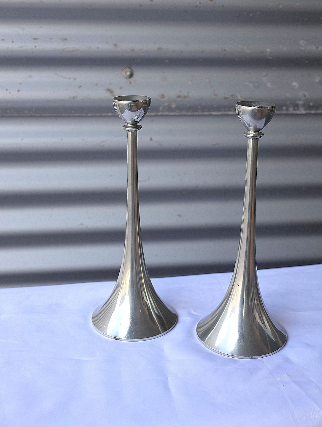 Just Andersen. Par høje lysestager af poleret tin. Model 2766.
