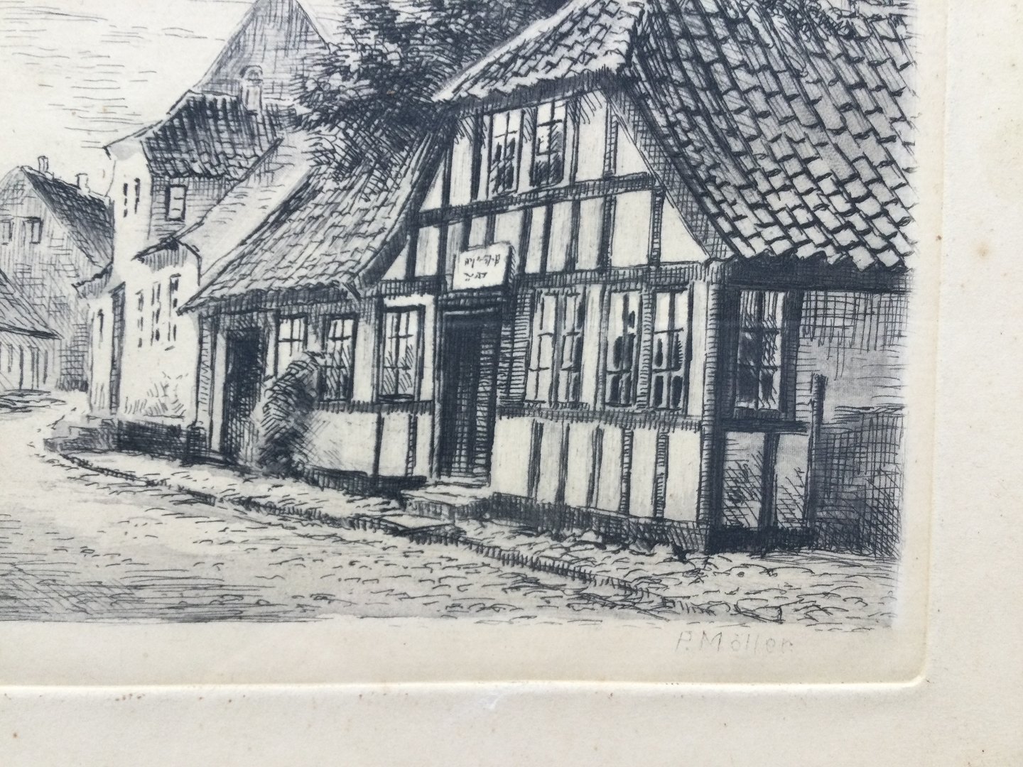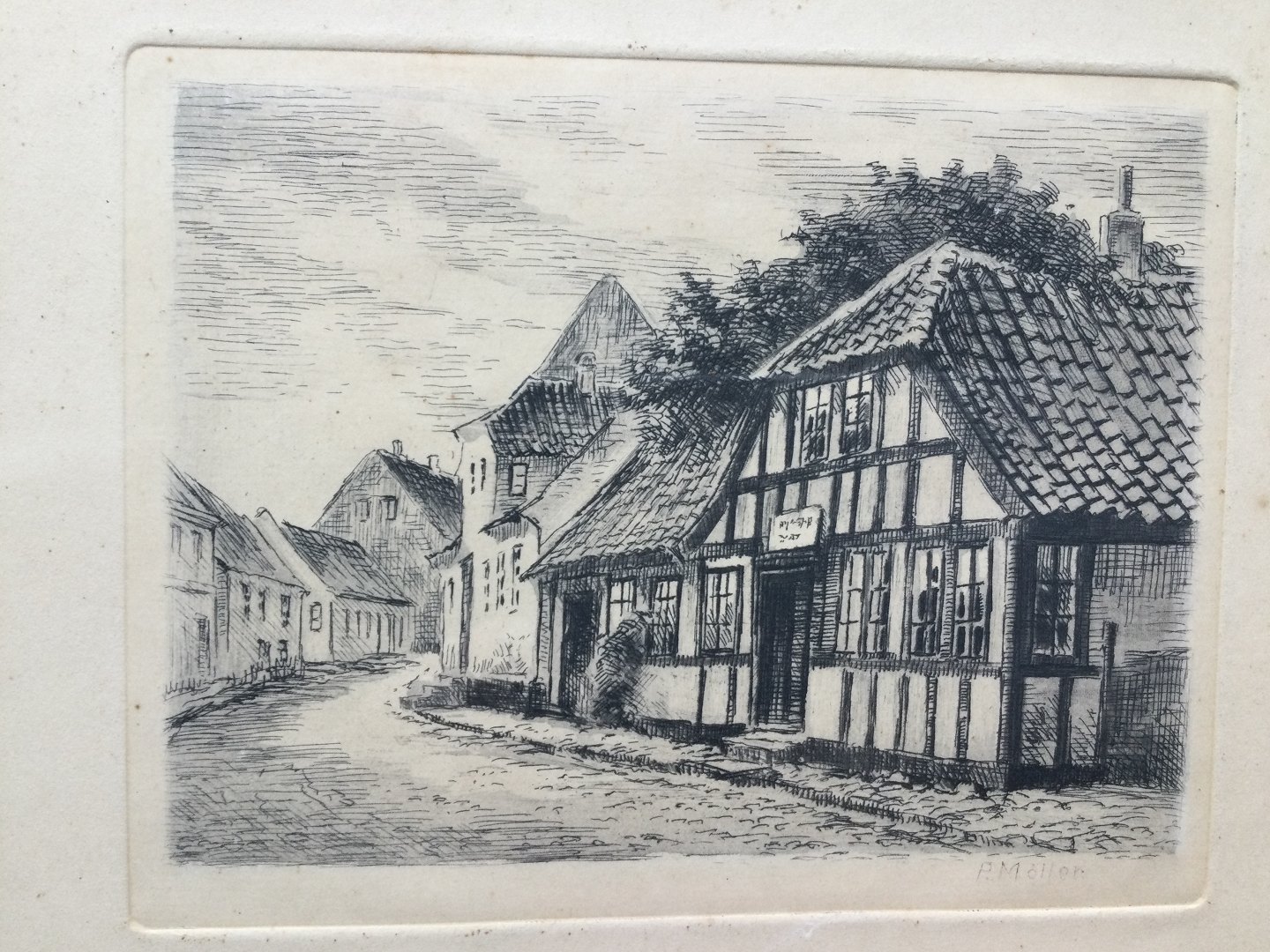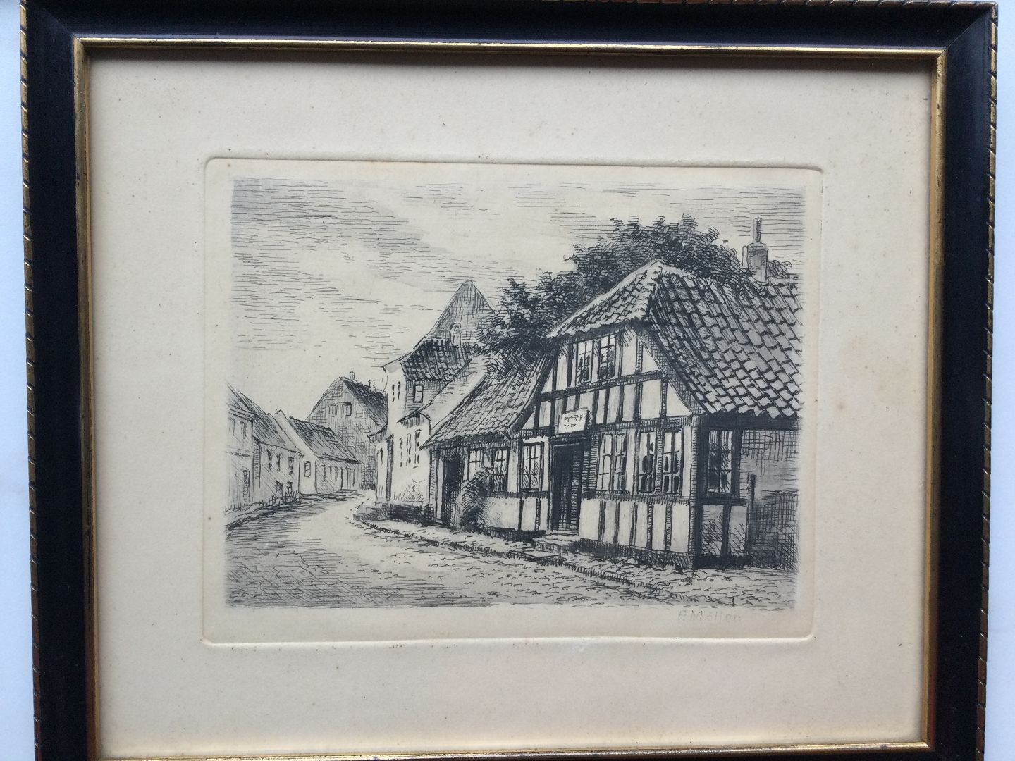 Radering af Peder Møller - Farvergården i Ebeltoft.