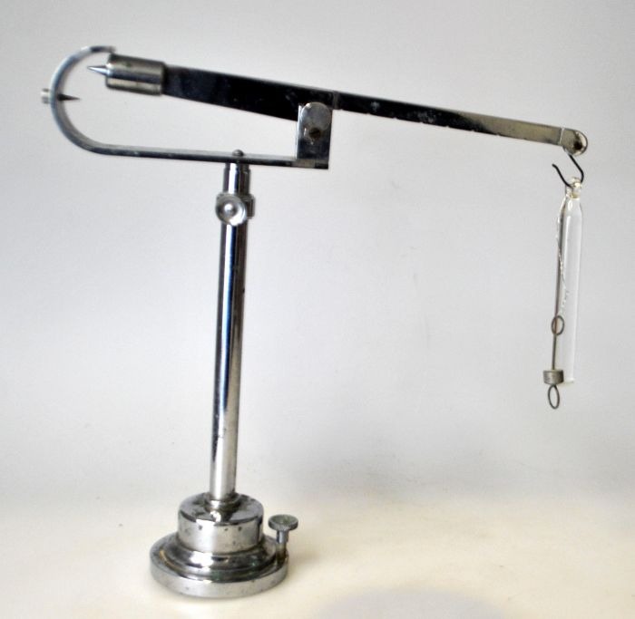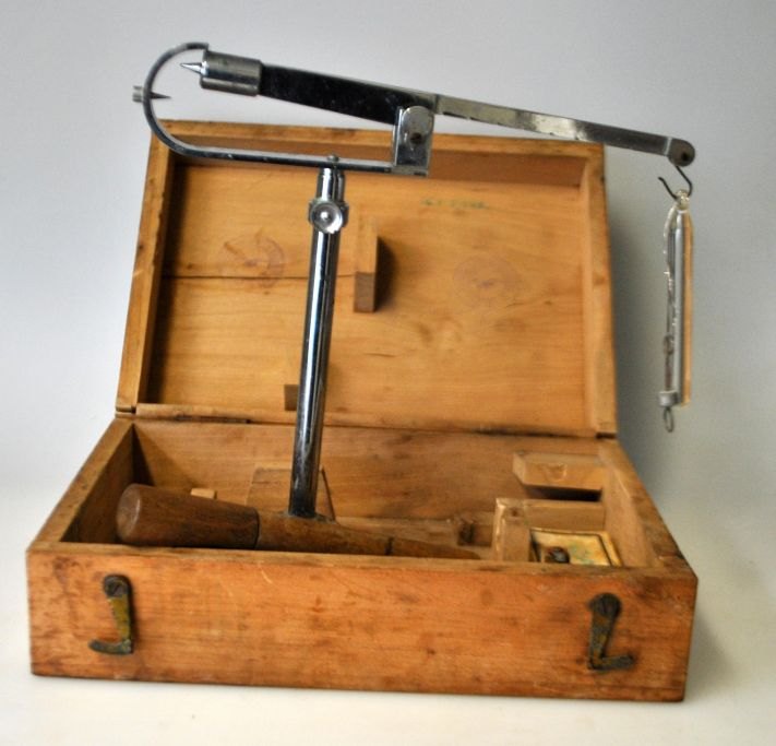 Westphal weight, 19th century. From Nørrevold Apotek, Nyborg. Height: 21 cm. With extra platinum thread. In accompanying wooden box, Thermometer included, hooks and tweezers.