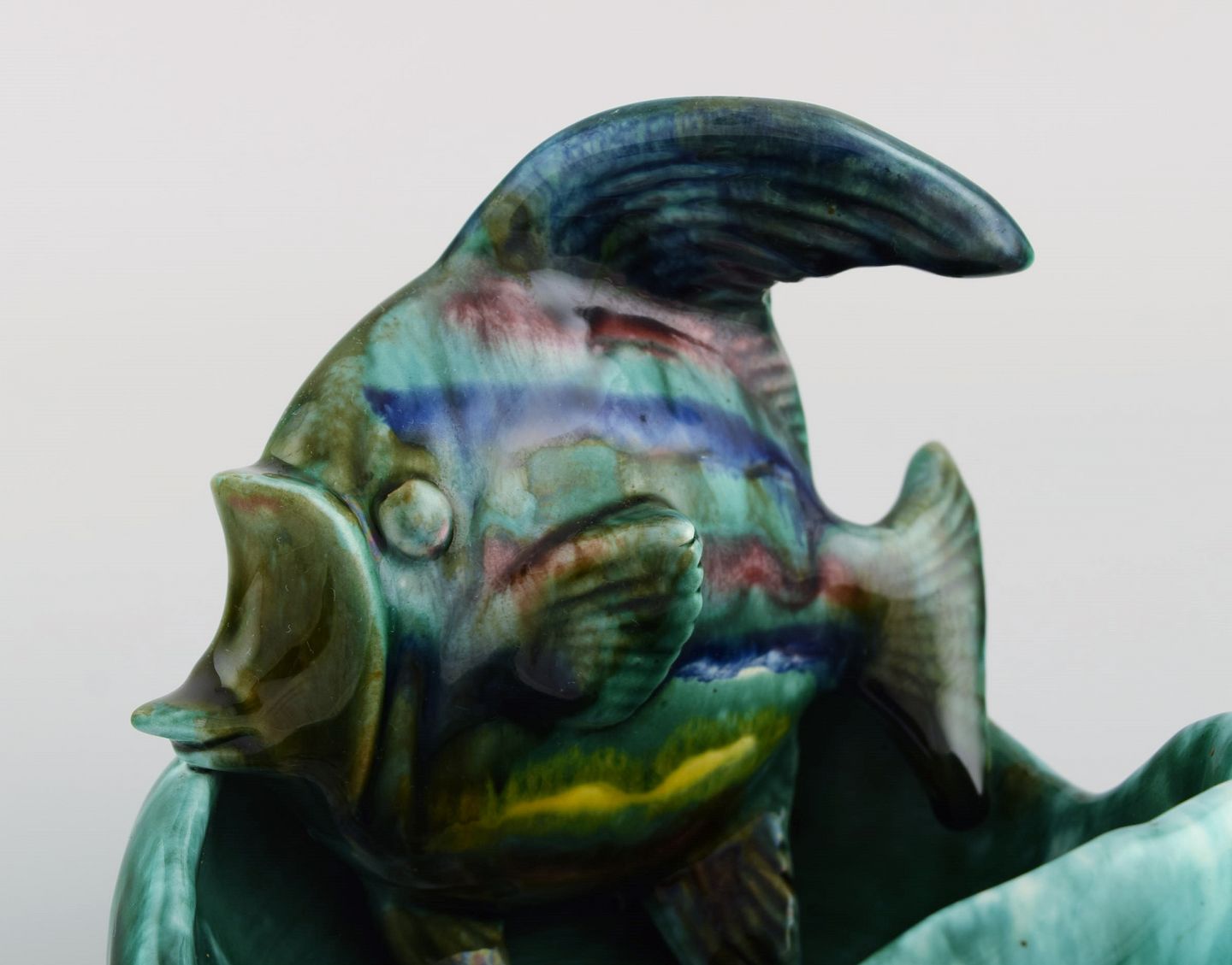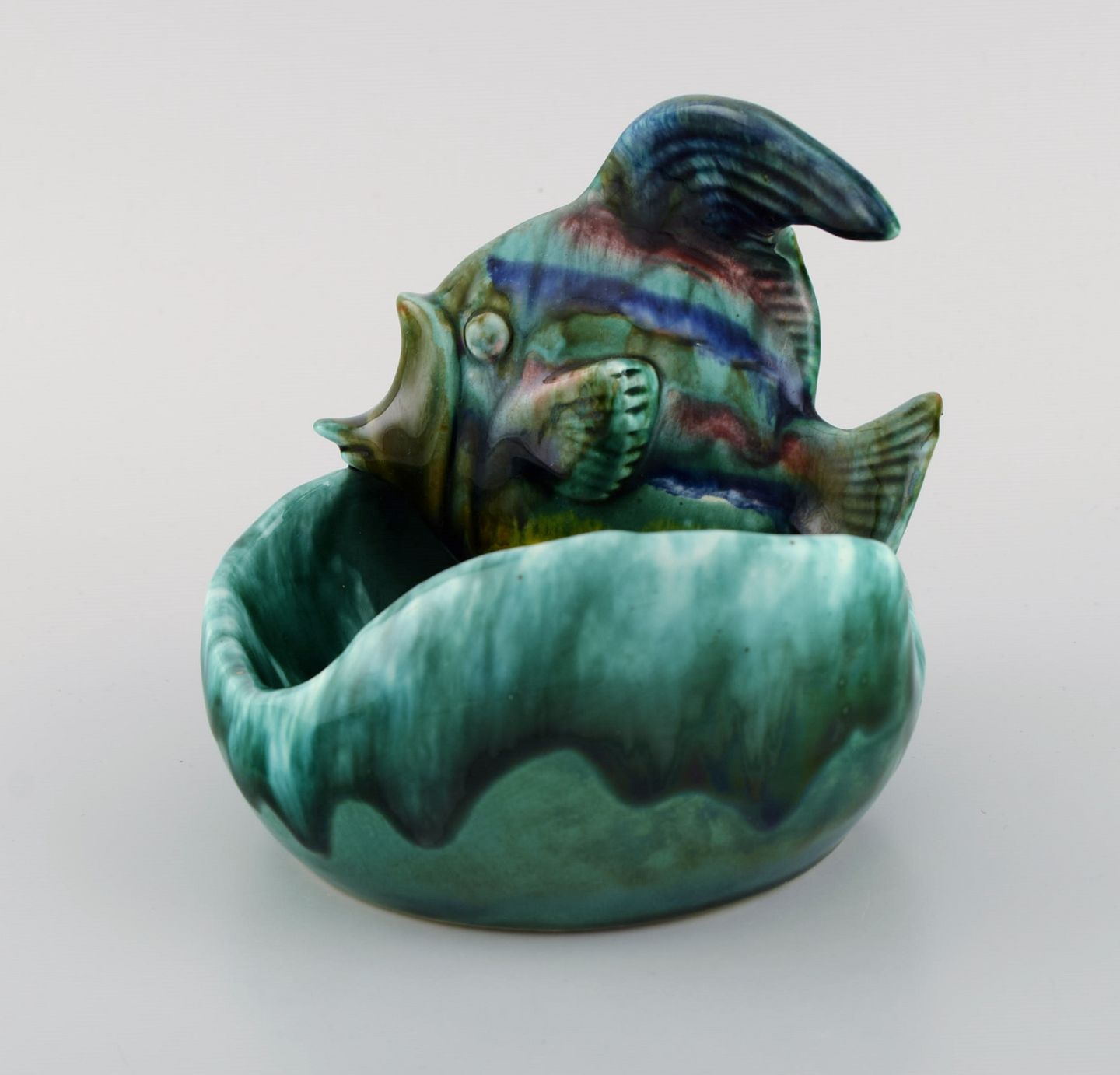 Belgisk studio keramiker. Skål i glaseret keramik modelleret med fisk. Smuk glasur i blågrønne nuancer. 1960/70'erne.