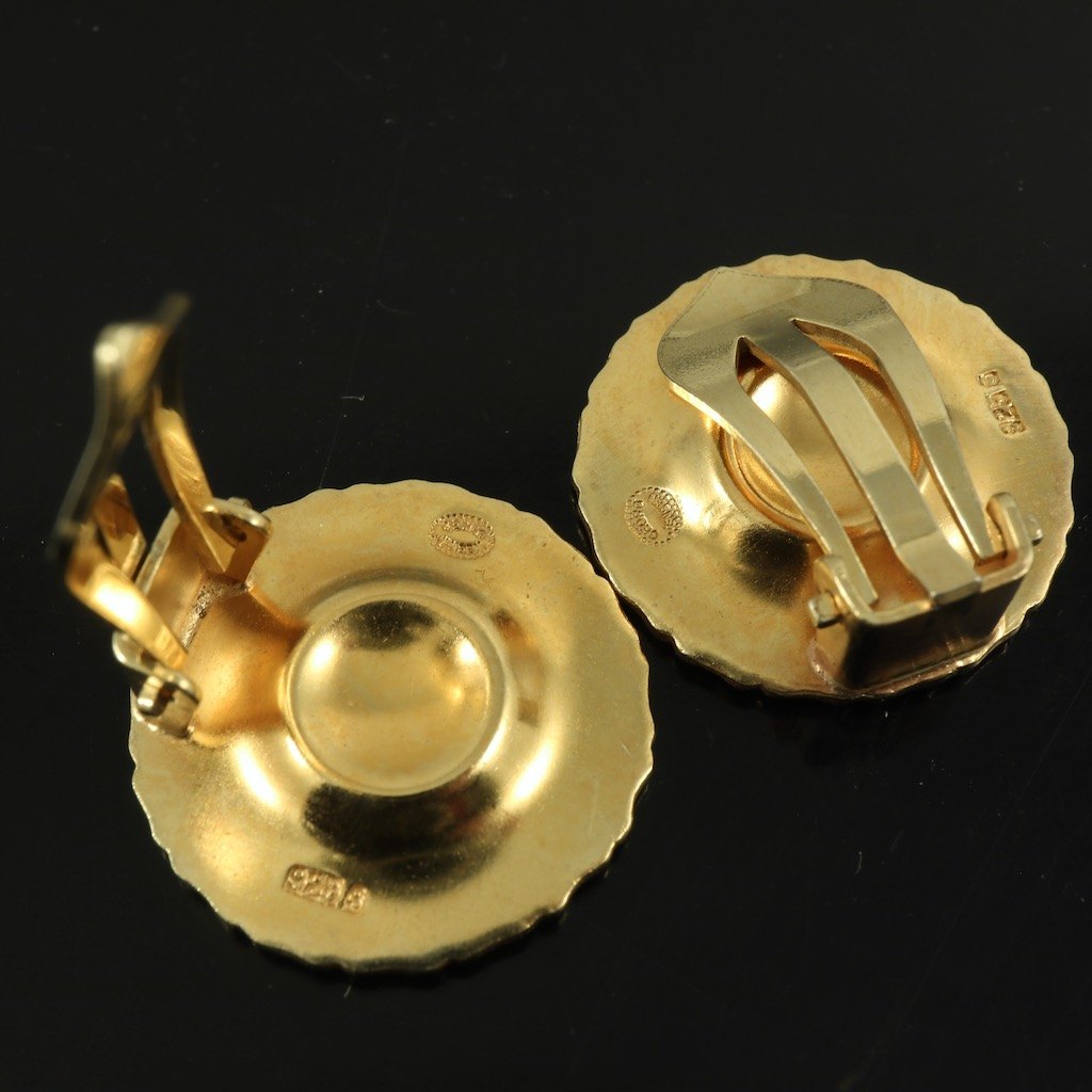Bernhard Hertz. Marguerit / Daisy øreklips i forgyldt sterlingsølv med hvid emalje.