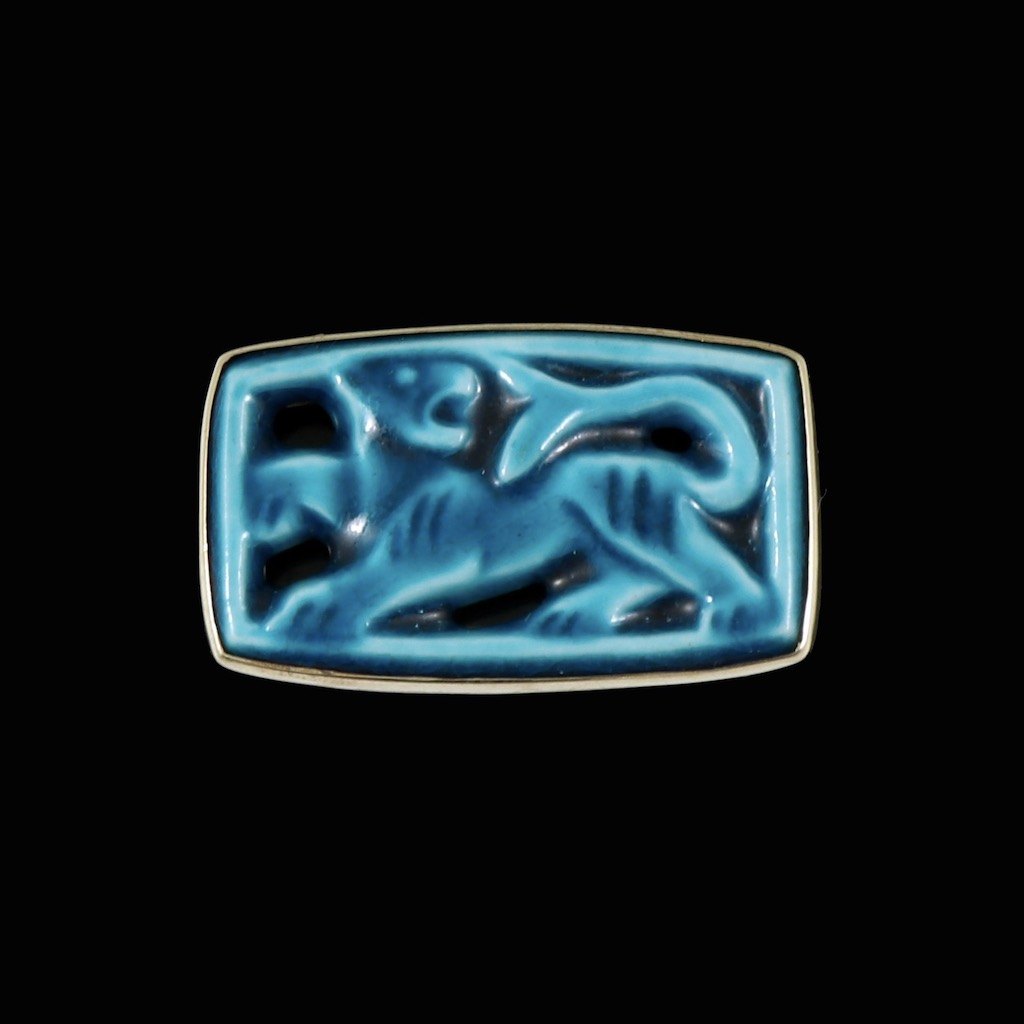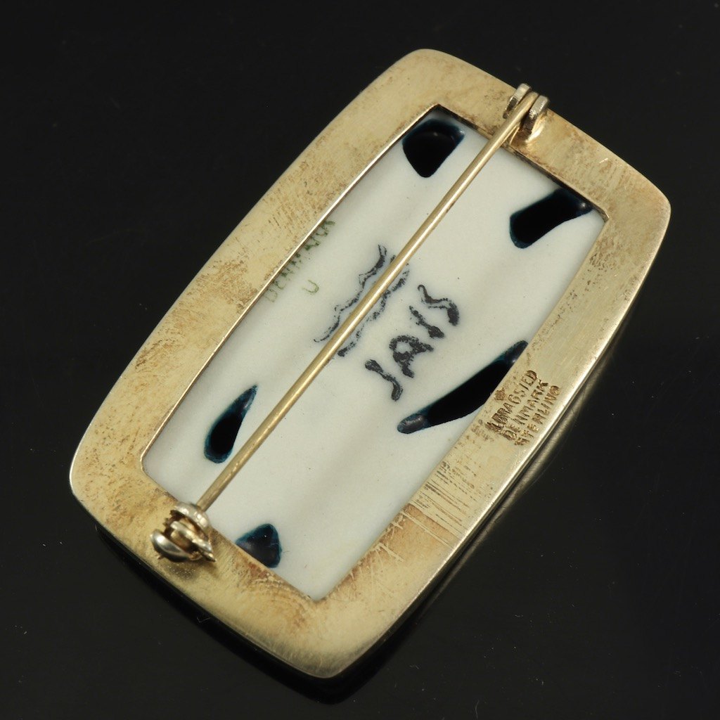 Jais Nielsen 1885-1961. Broche i keramik med blå glasur med montering i forgyldt sterling sølv.