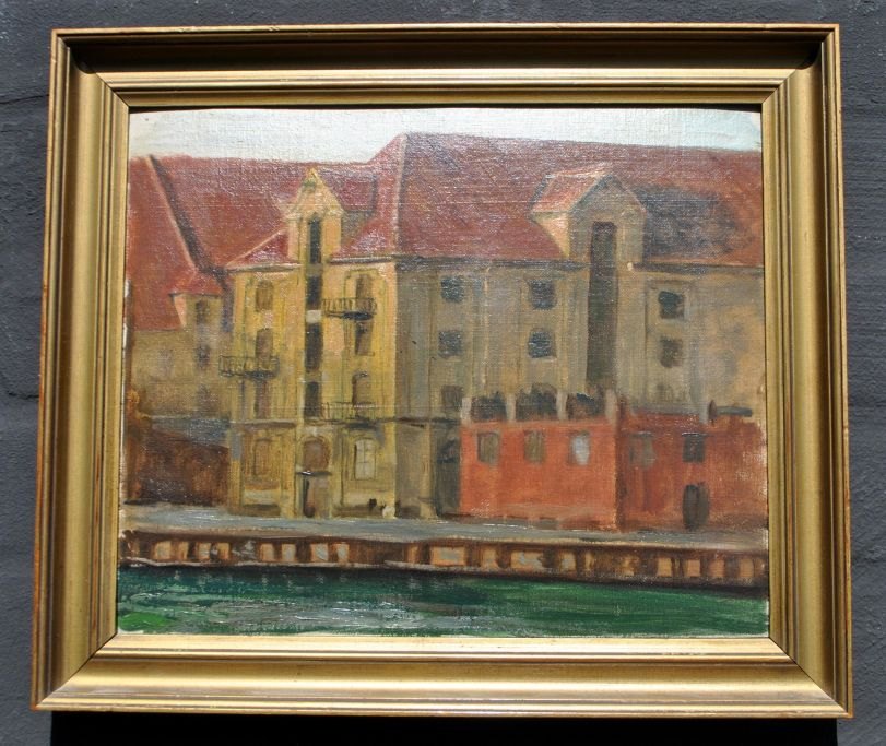 Hou, Hans Axel (1860 - 1948) Denmark: Warehouse Christianshavn, København. Oil on canvas / cardboard. 23 x 28 cm. Stamped on the back from the artists' estate auction in Copenhagen at Kunsthallen 1948 as no. 175.