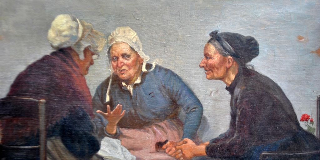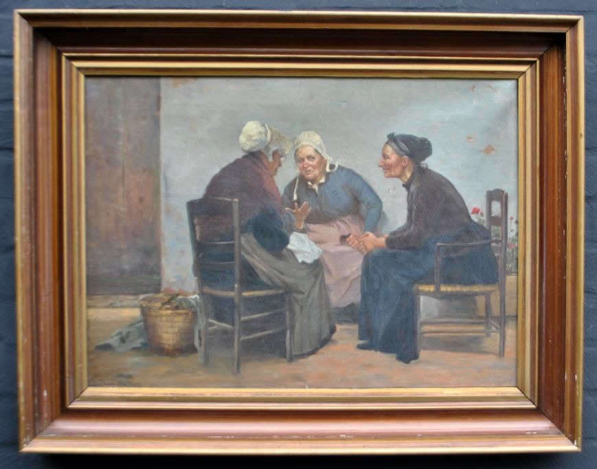 Simony Jensen, Oluf (1864 - 1923) Denmark: Three women in conversation. Oil on canvas. Signed 1902. 45 x 60 cm.