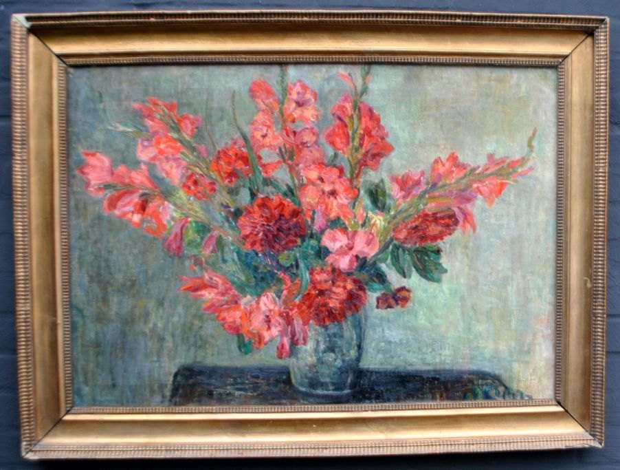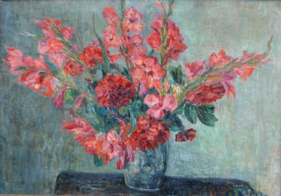 Danish artist (20th century): Arrangement with flowers on a table. Oil on canvas. Signed monogram: osm 60 x 88 cm.