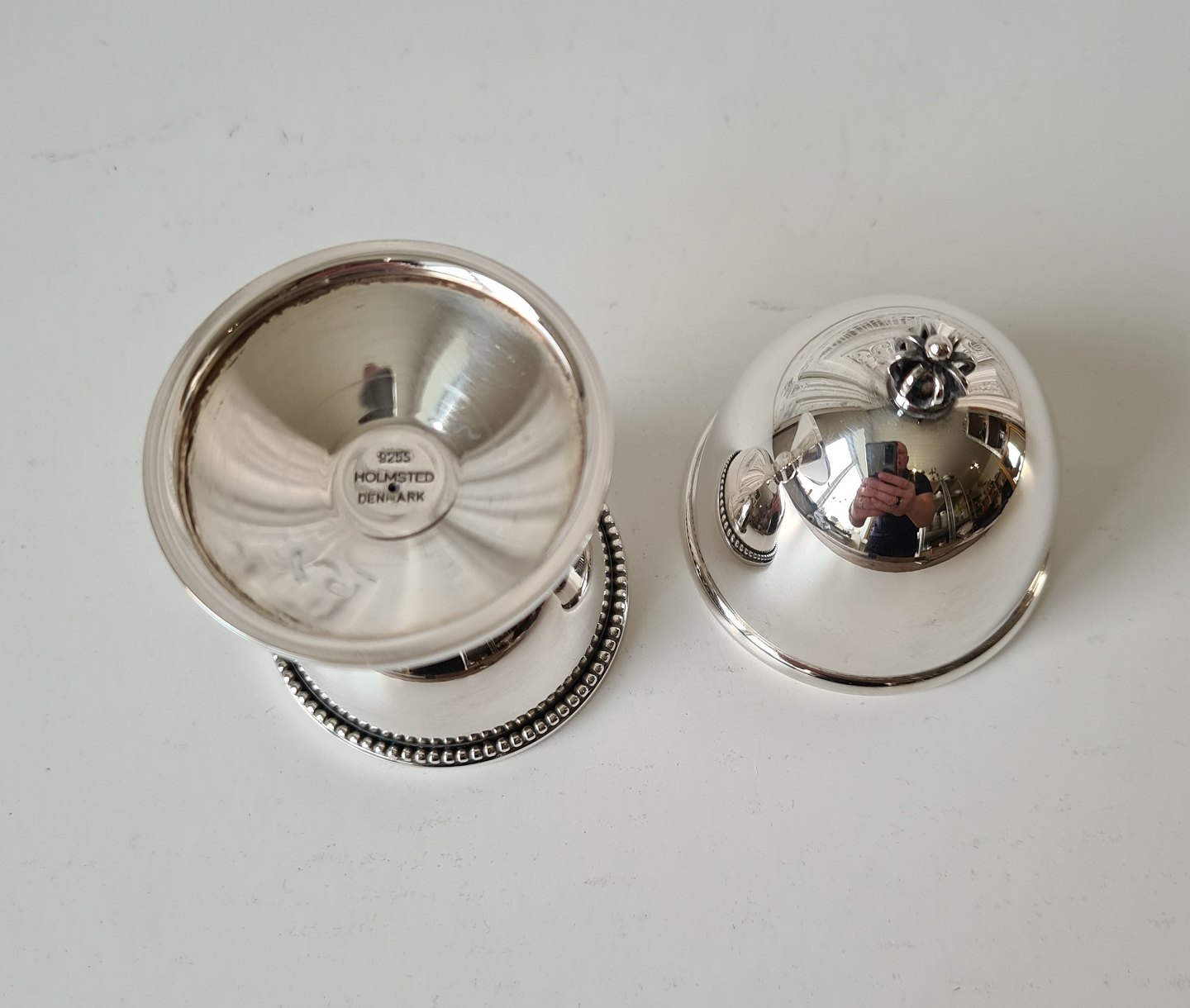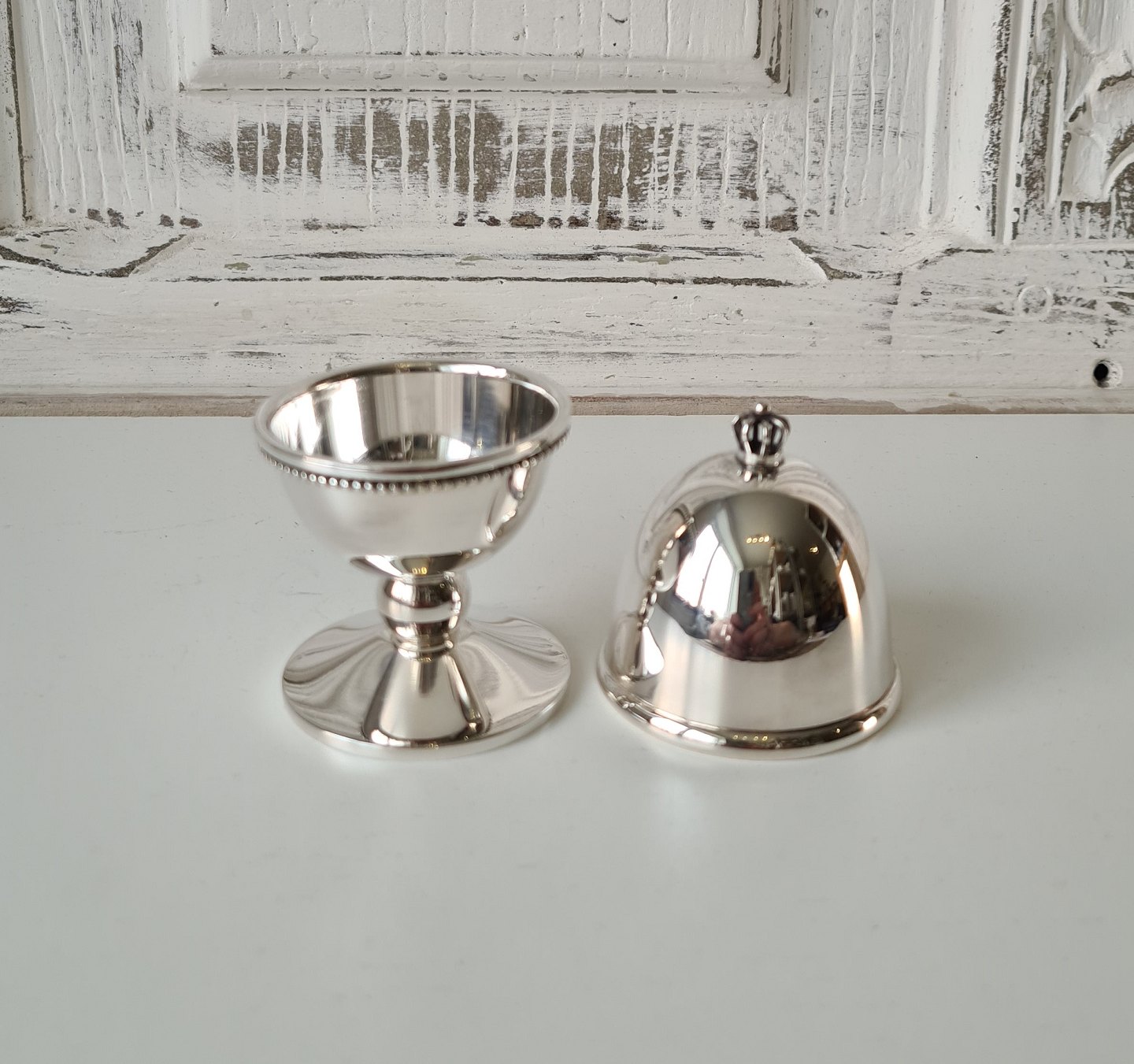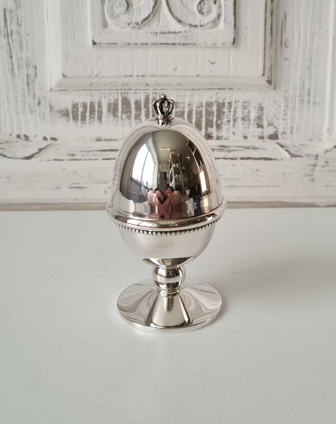 Æggebæger i sterlingsølv, lågknoppen er udformet som en krone.