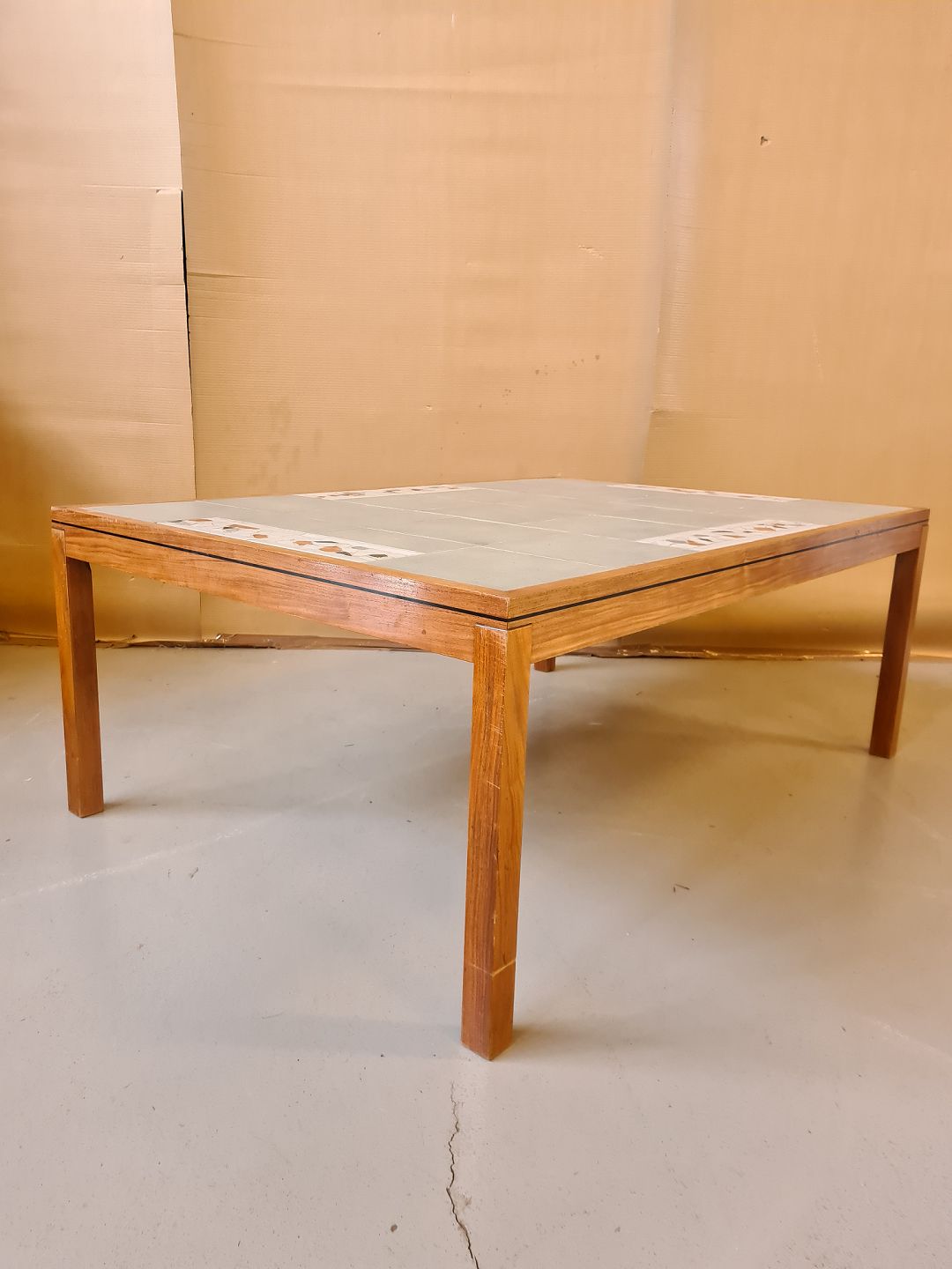 Sofabord i fineret teaktræ med kakler fra 1970erne.
