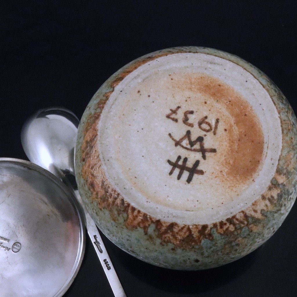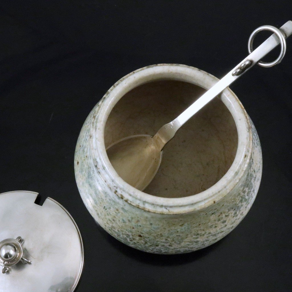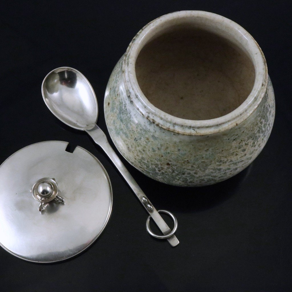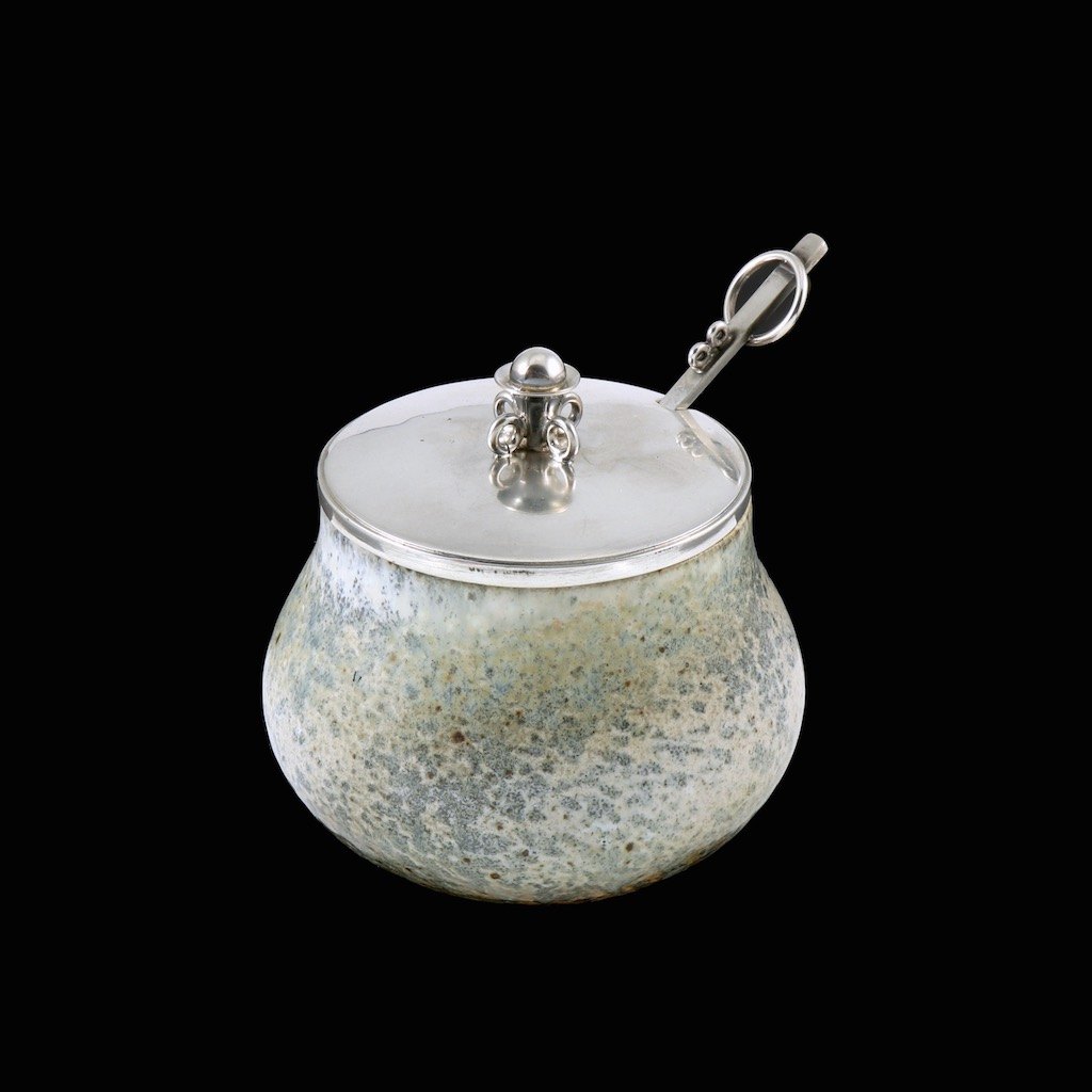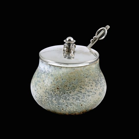 Hans Hansen. Krukke i stentøj med låg og ske i sterlingsølv.