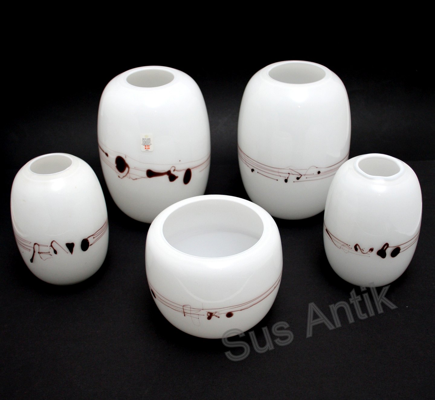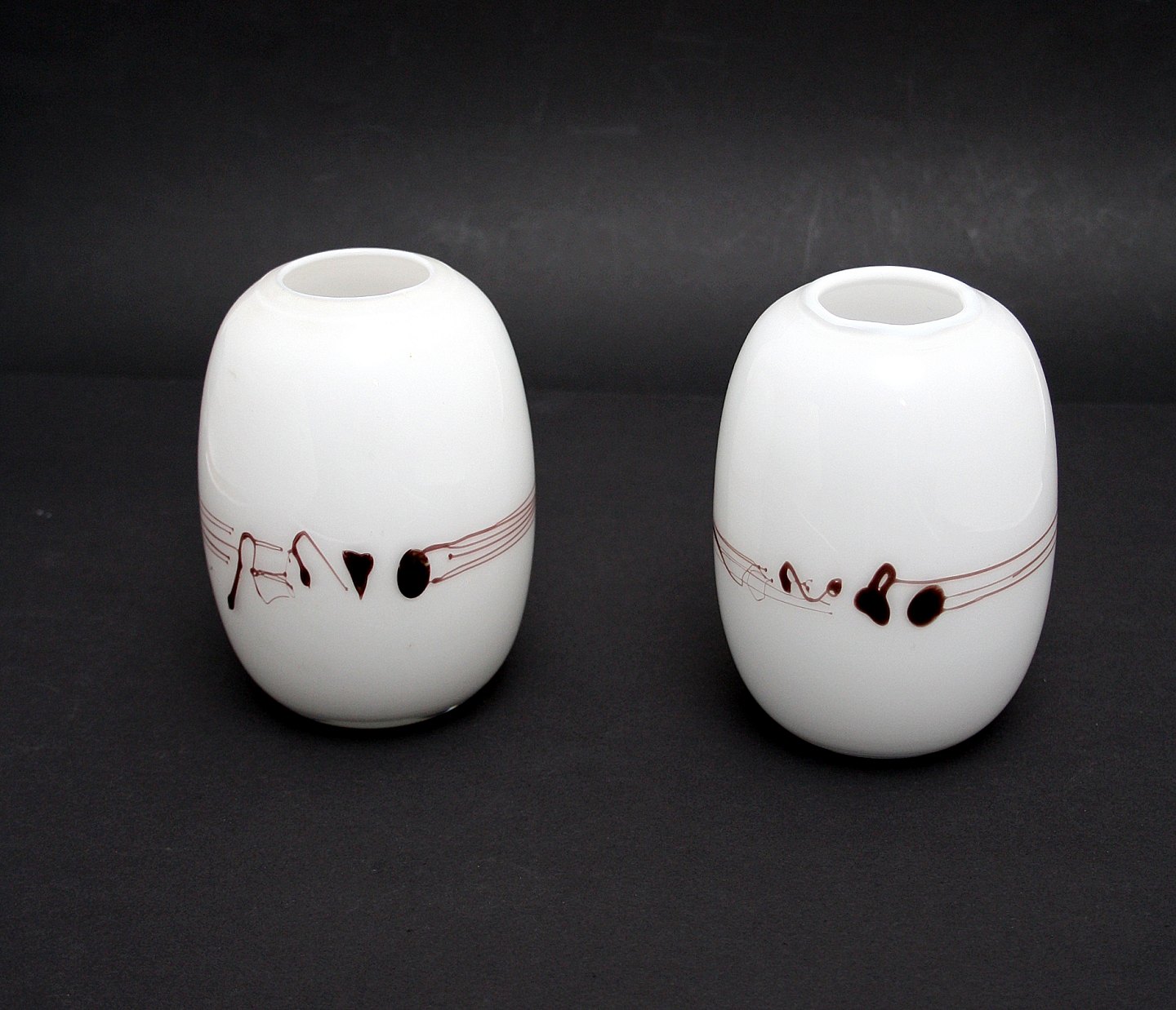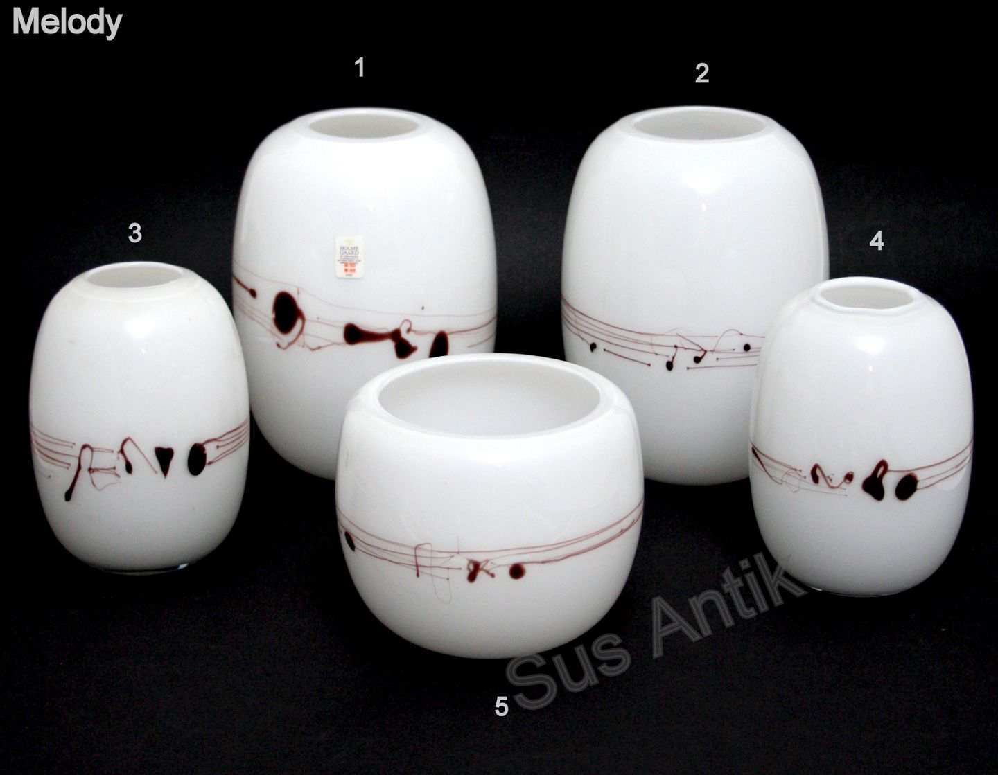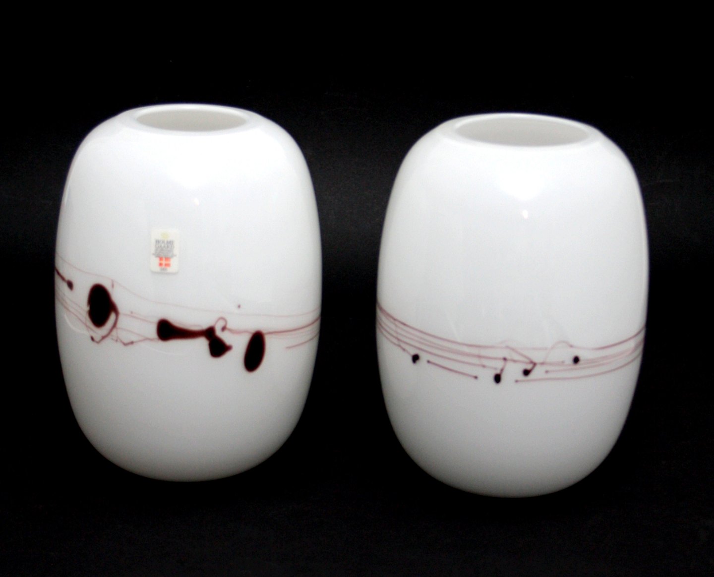 Holmegaard, Melody vaser designet af Michel Bang i 1983. Opalhvid glas med pålagte tråde og dråber, så det ligner noder.
