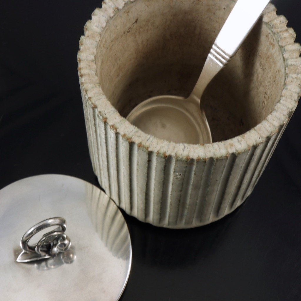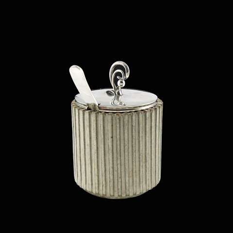 Arne Bang - A.F. Rasmussen. Krukke i stentøj med låg samt ske i sterlingsølv.