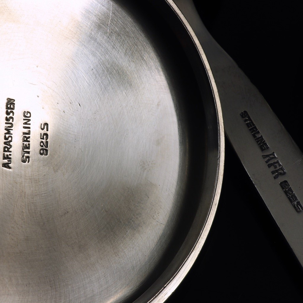 Låg samt ske i sterlingsølv designet of udført hos A.F. Rasmussen - Aarhus 1903 - 1998. Stemplet: A.F. Rasmussen, sterling, 925s.