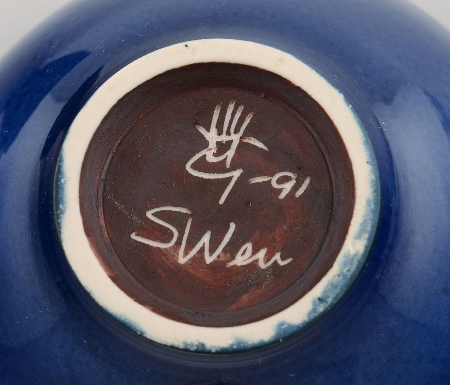 Sven Wejsfelt (1930-2009), Gustavsberg Studiohand. Unika skål i glaseret keramik med håndmalede fugle. Smuk glasur i blå nuancer. Dateret 1991.