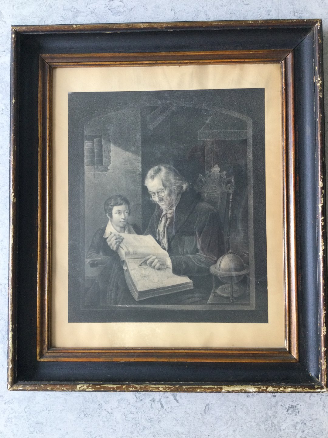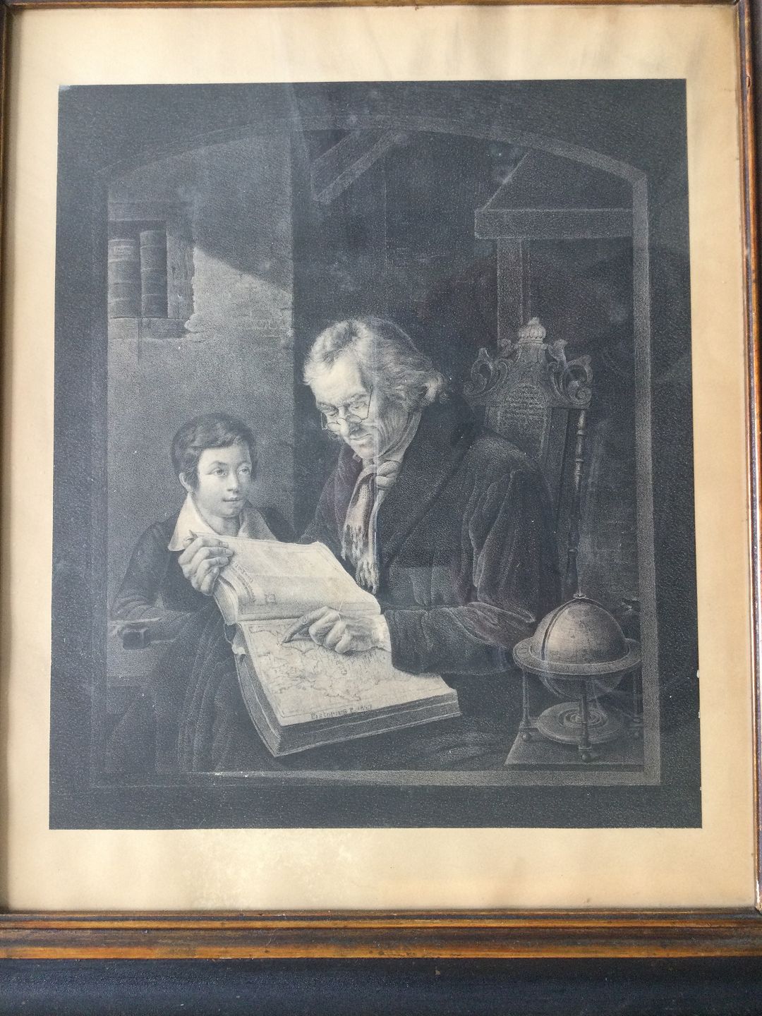 Text available in Danish: Stålstik - Geografi time efter maleri af Eduard Karl Gustav Pistorius Lebrecht.
