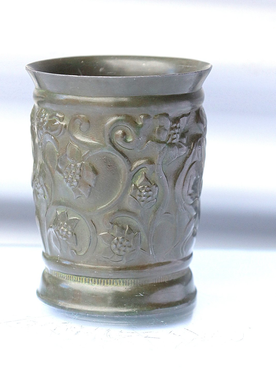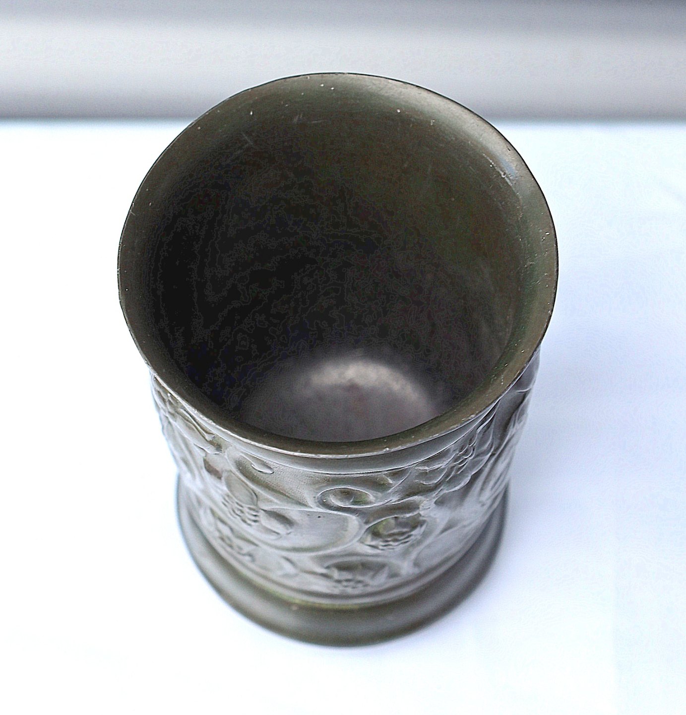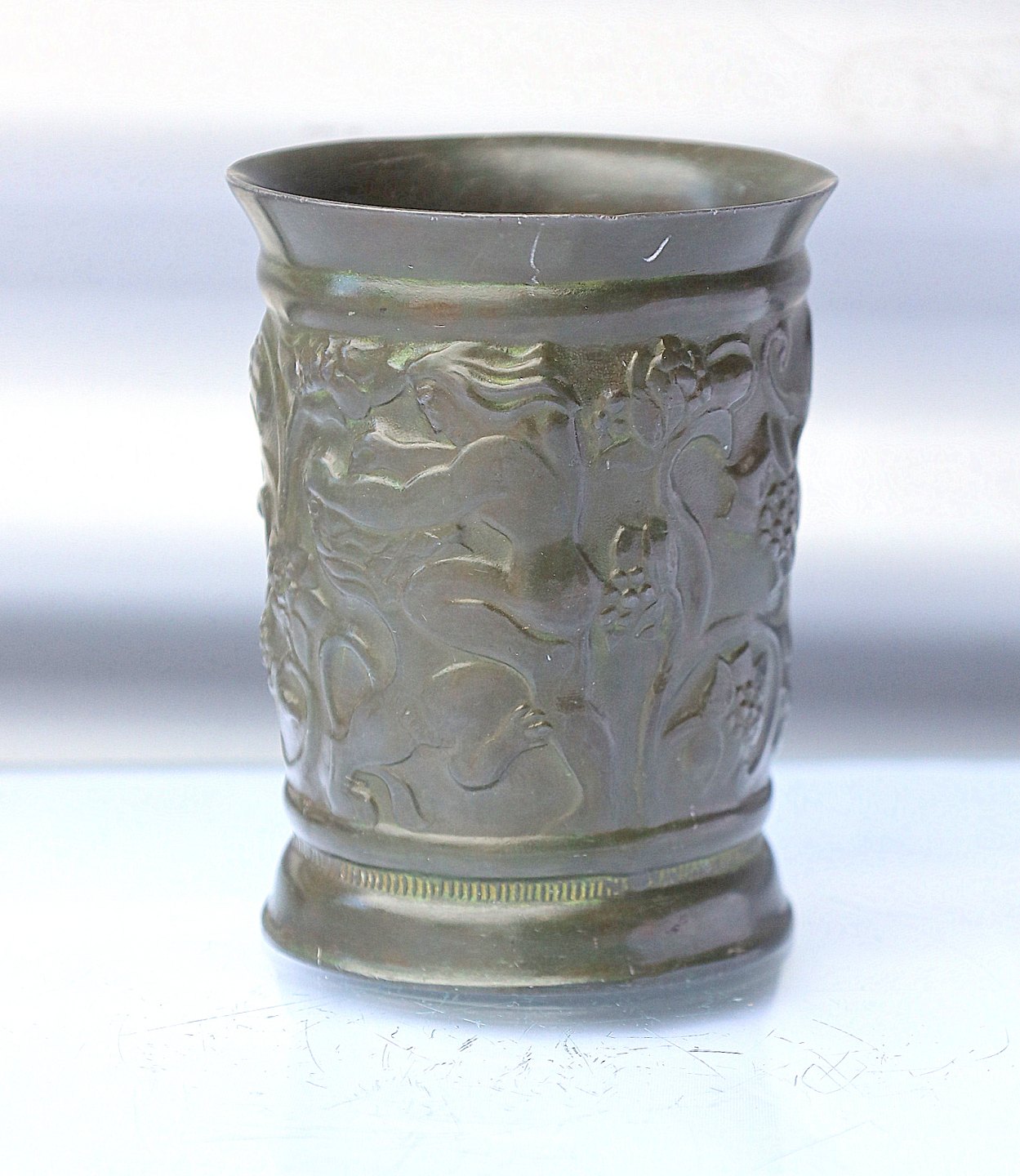 Just Andersen. Disko metal vase, nr. 159. Vasen er dekoreret med 2 figurscenerier. Mand der er en løve, og mand og kvinde, samt bær.