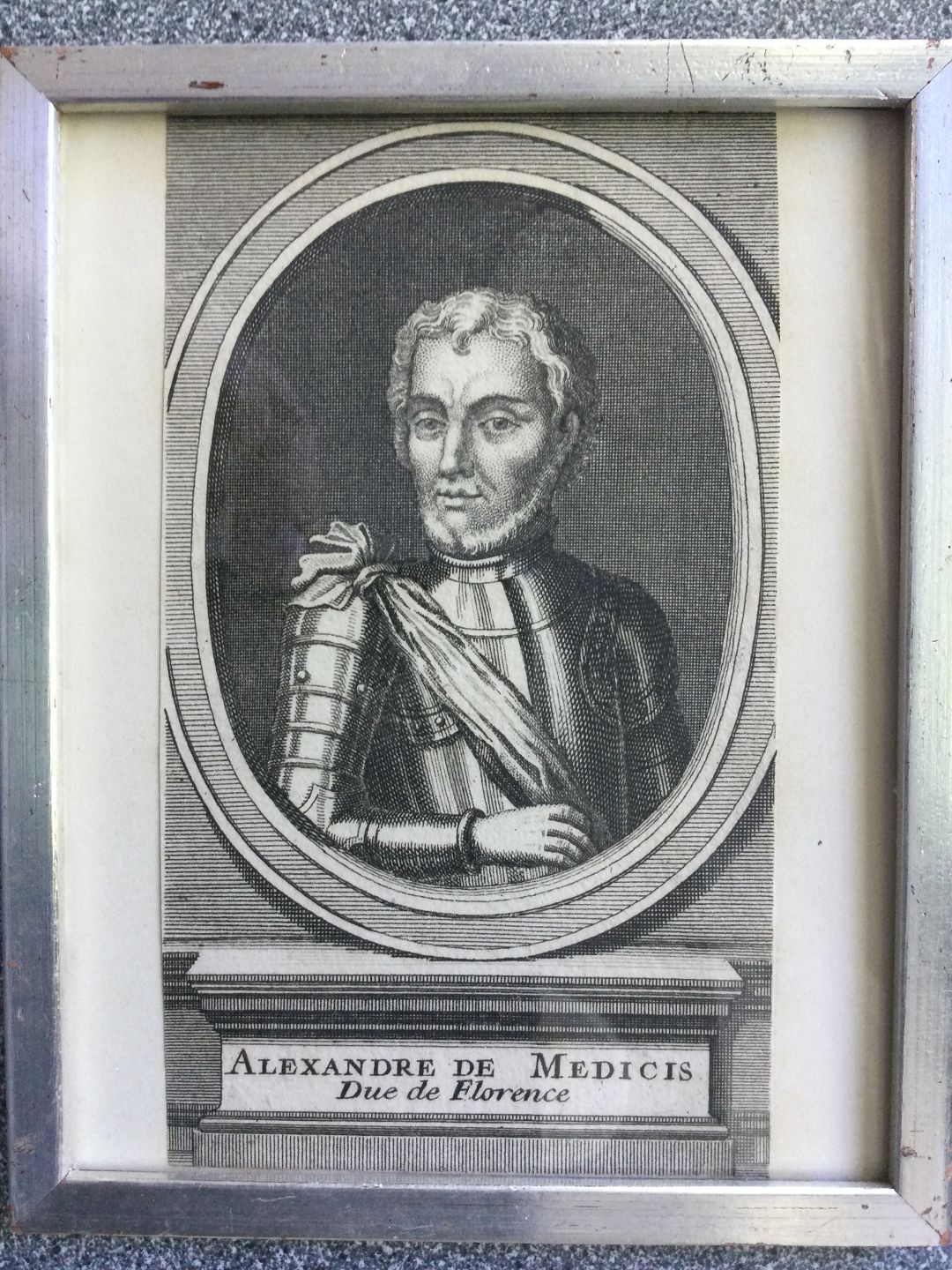 Text available in Danish: Kobberstik - portræt af Hertug Alexander af Medici (1510-37).