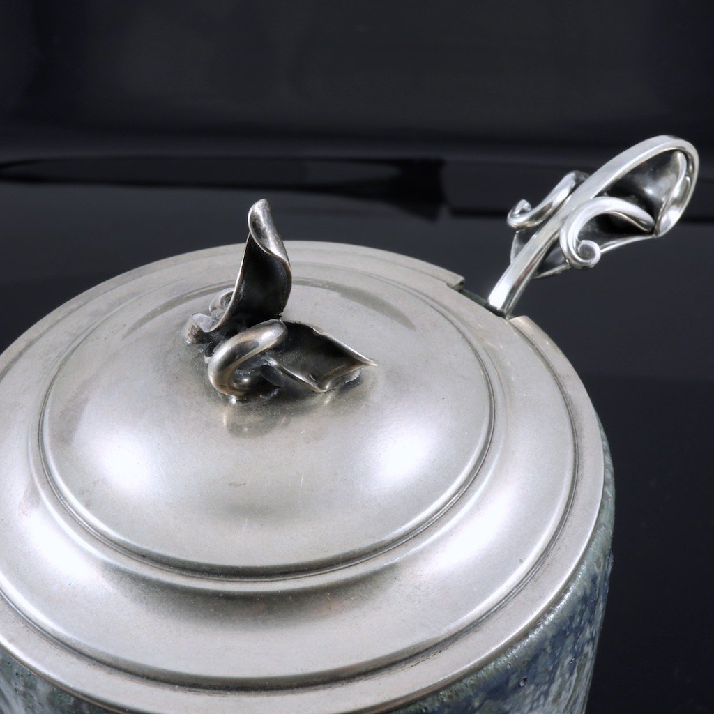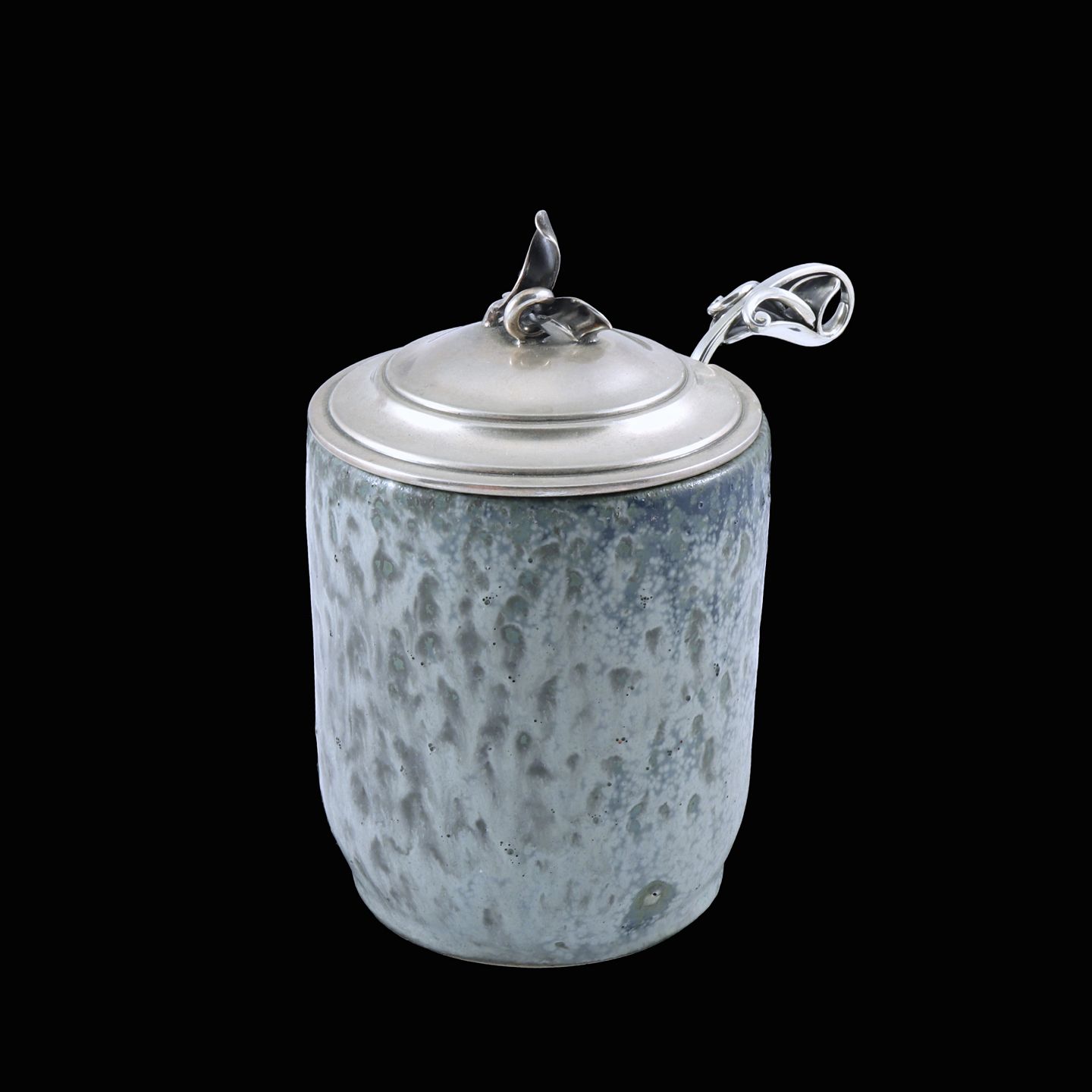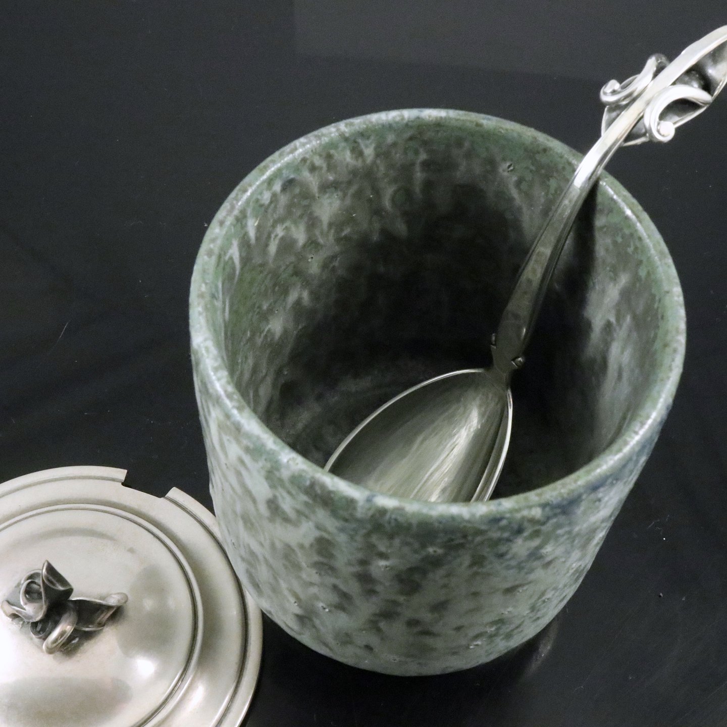 Arne Bang - C. Holm. Krukke i stentøj med låg og ske i sølv.
