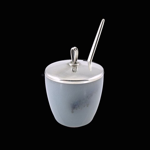 Royal Copenhagen - E. Dragsted. Krukke i stentøj med låg og ske i sterlingsølv.