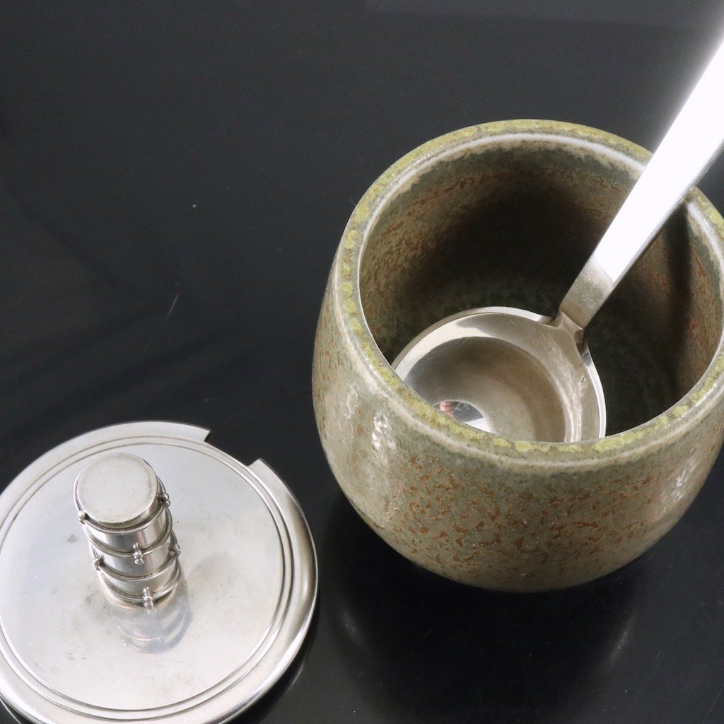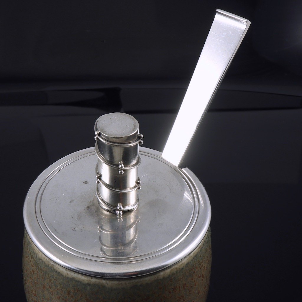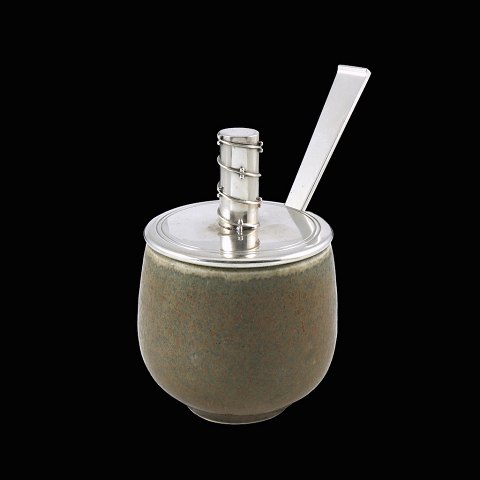 Royal Copenhagen - Hingelberg. Krukke i stentøj med låg og ske i sterlingsølv.