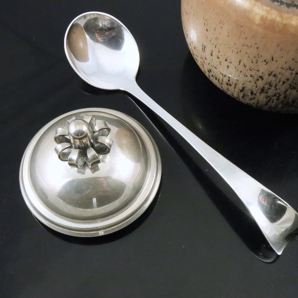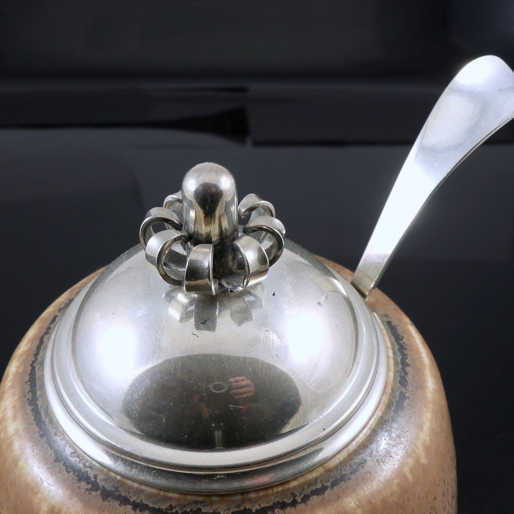 Saxbo. Krukke i stentøj med låg og ske i sølv.