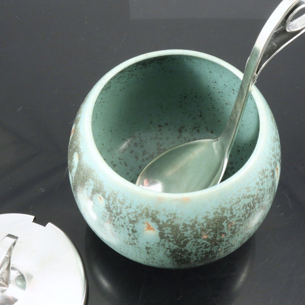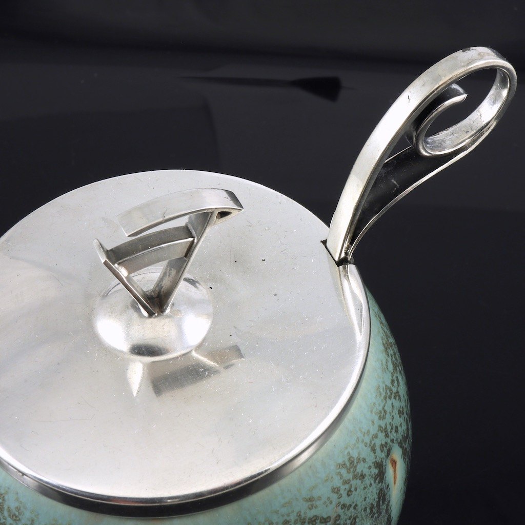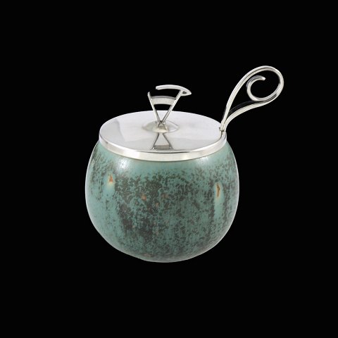 Saxbo - Frithjof Bratland. Krukke i stentøj med låg og ske i sølv.