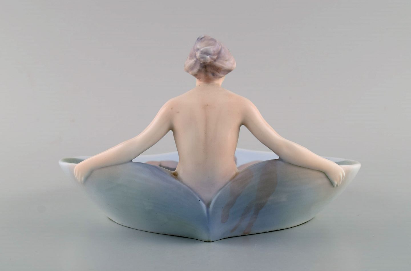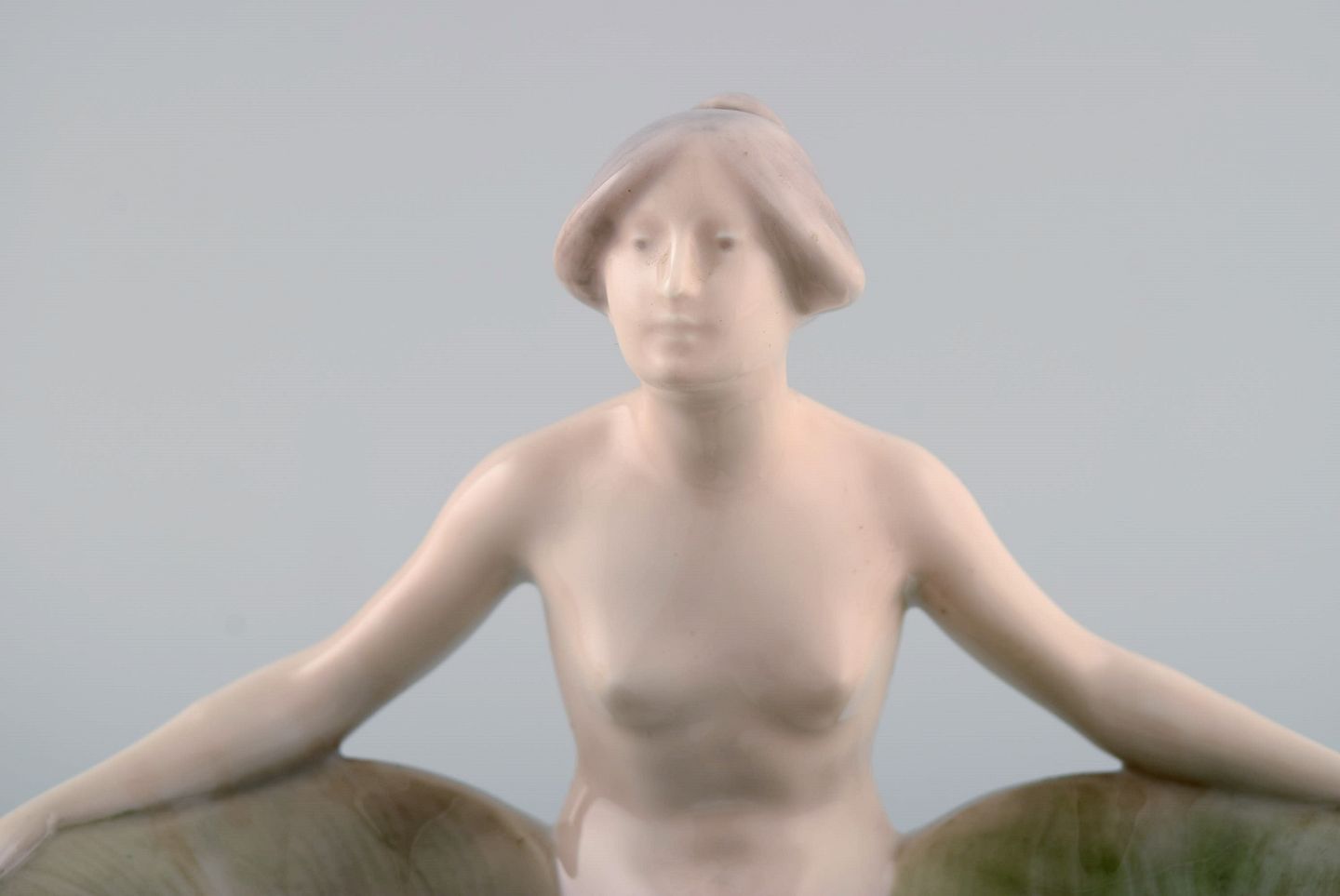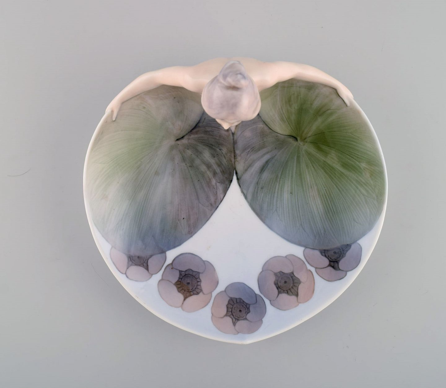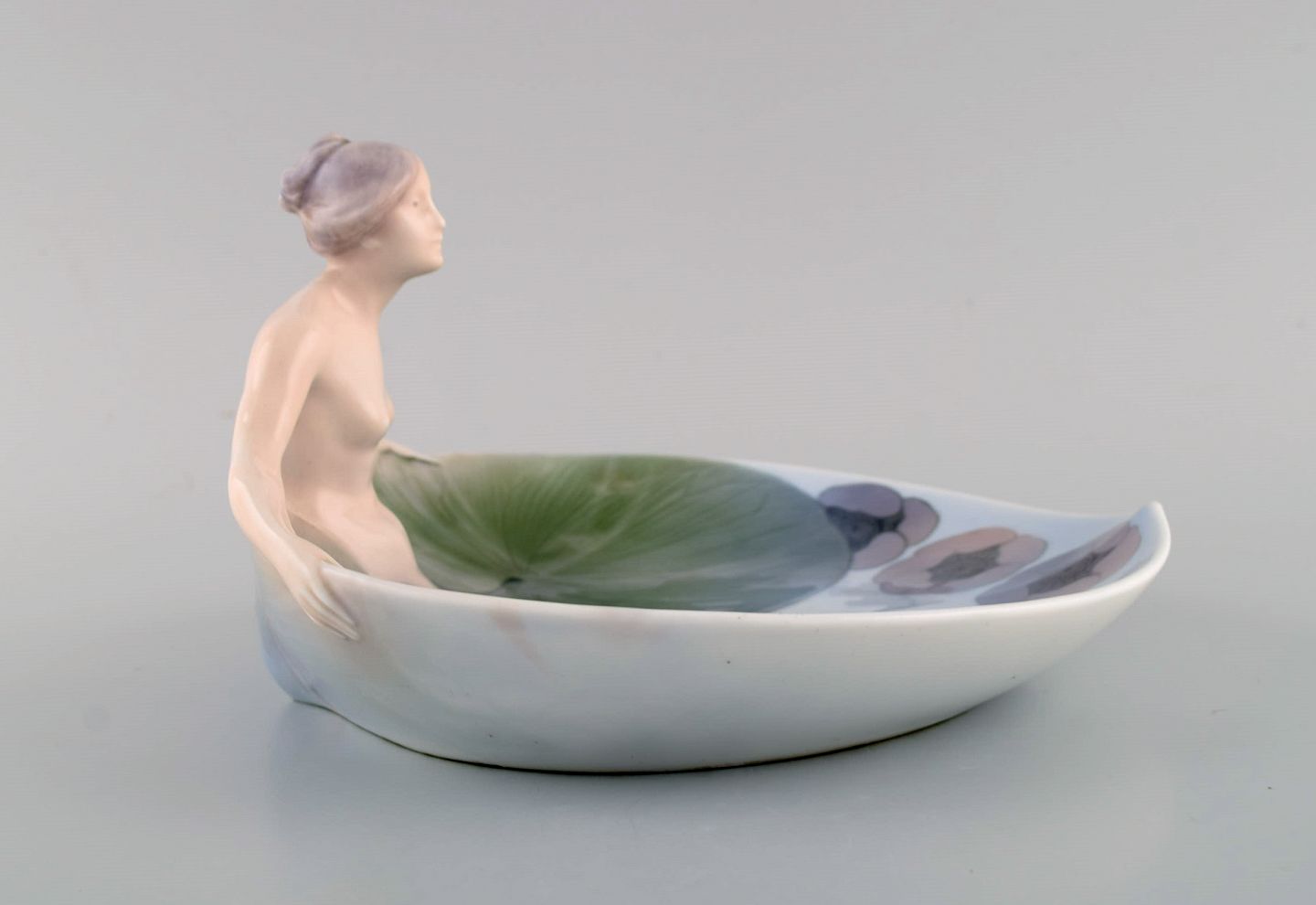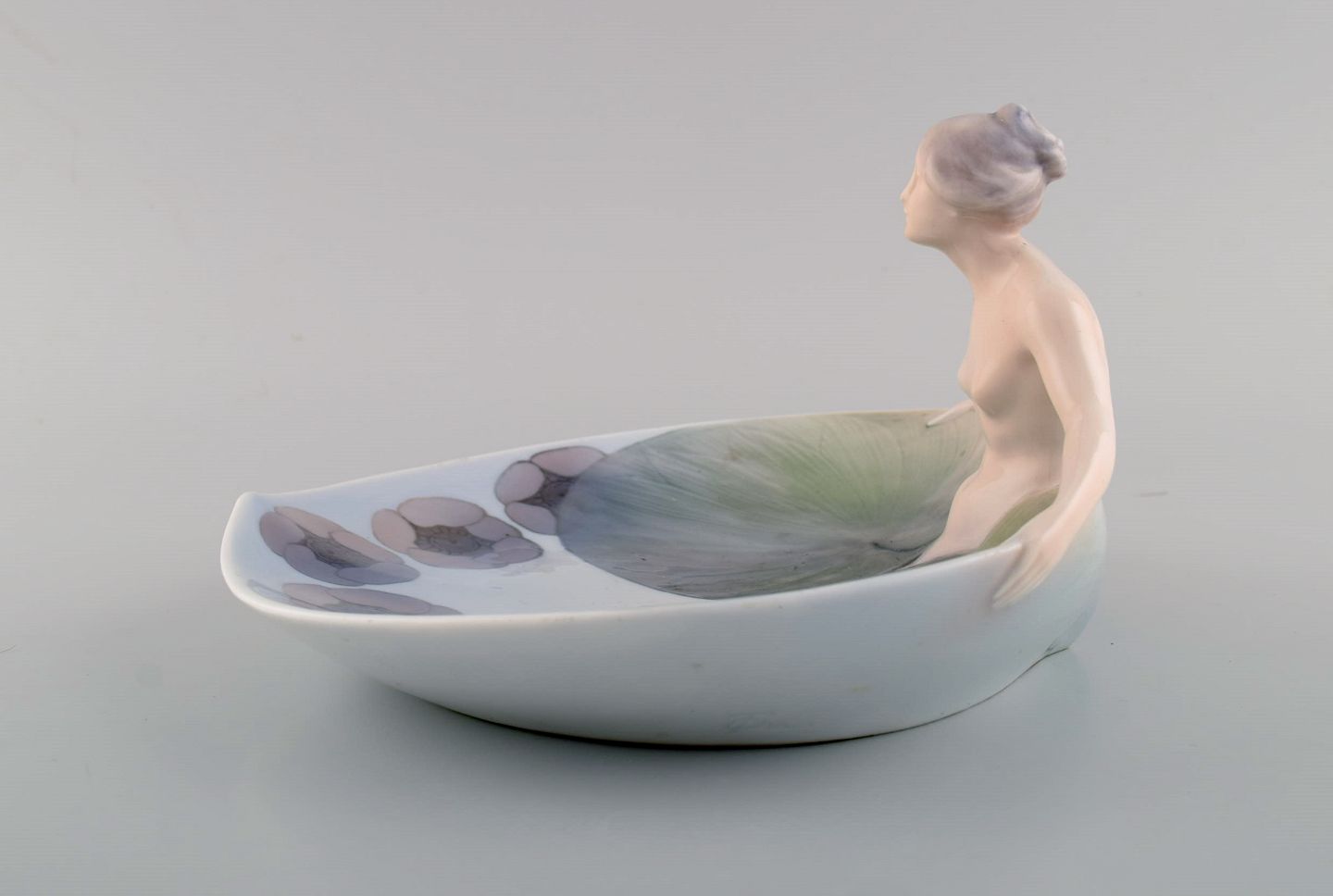 Early and rare Royal Copenhagen art nouveau dish in hand-painted porcelain. Naked woman and water lilies. Early 20th century.