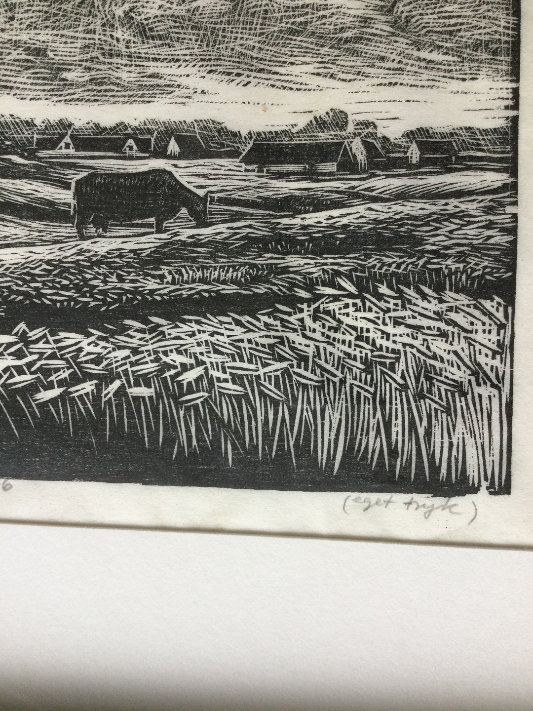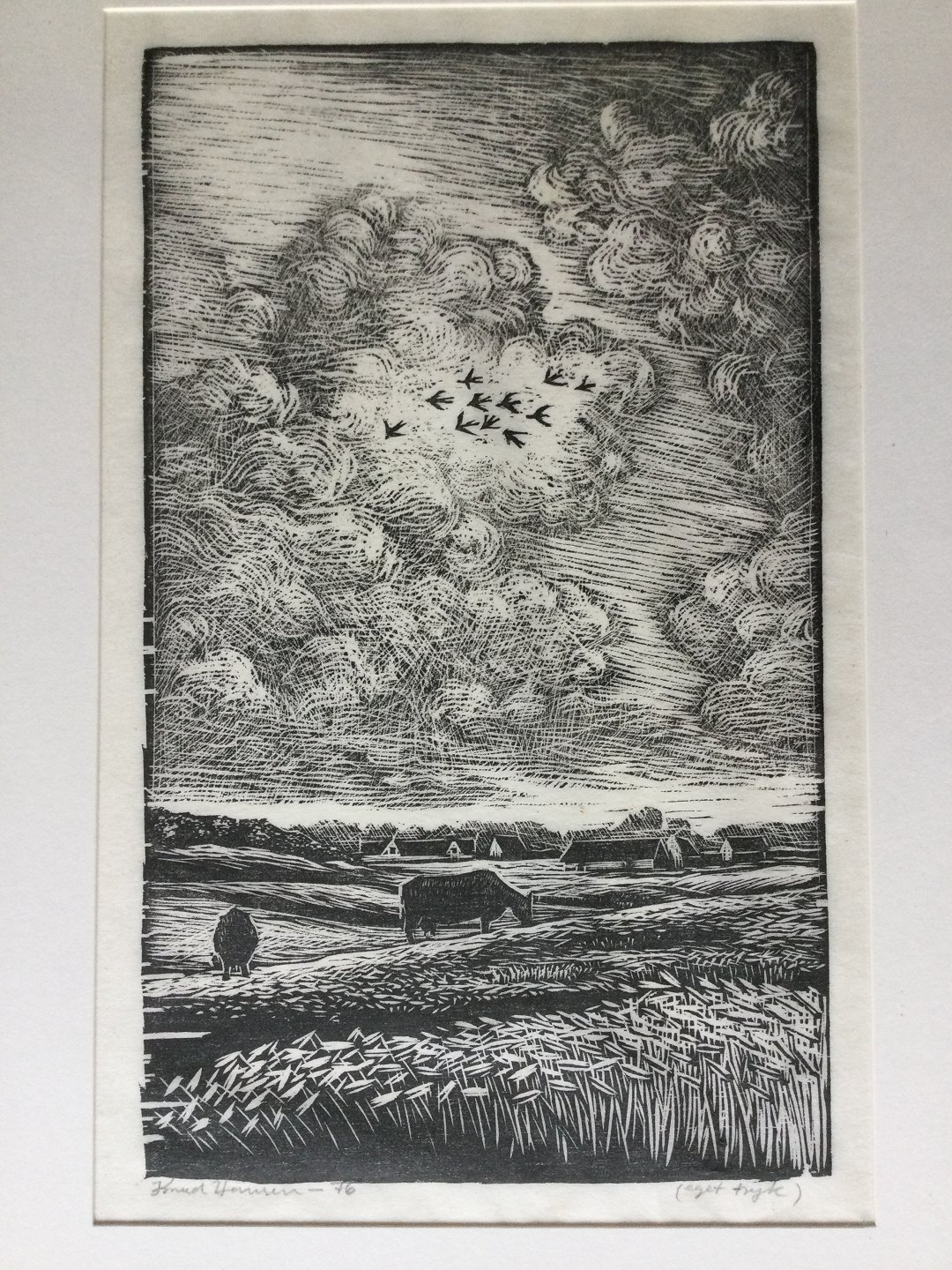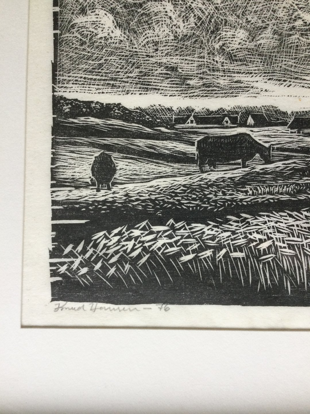 Træsnit af Knud Hansen - Køer på mark 1976.