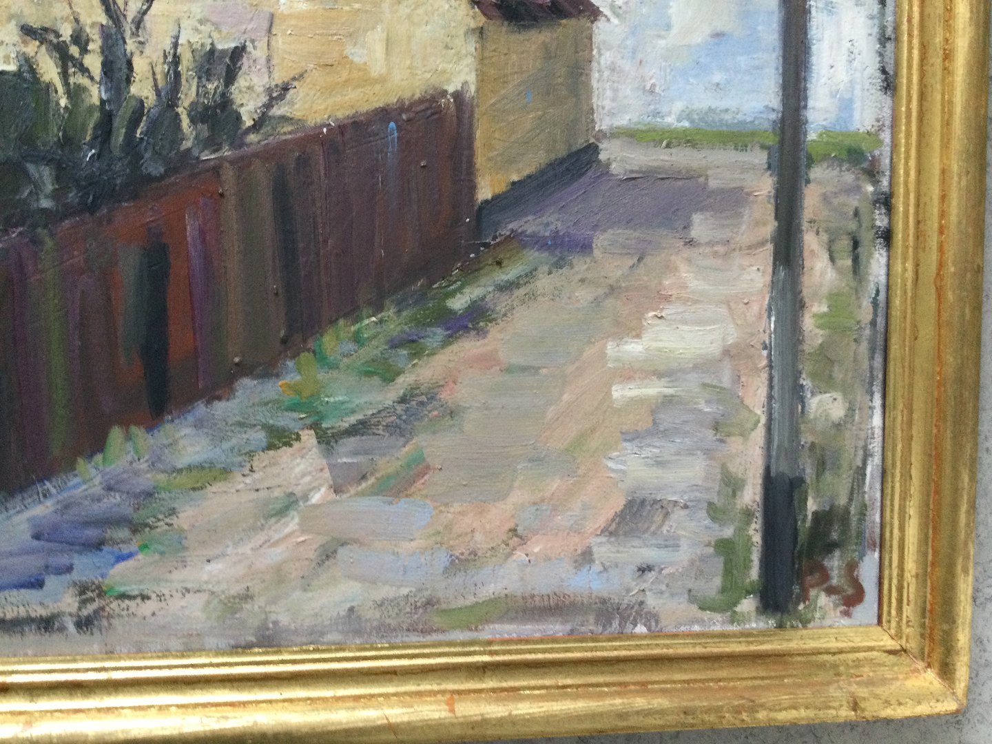 Text available in Danish: Maleri af Poul Sørensen - Byparti - antagelig Frederikshavn