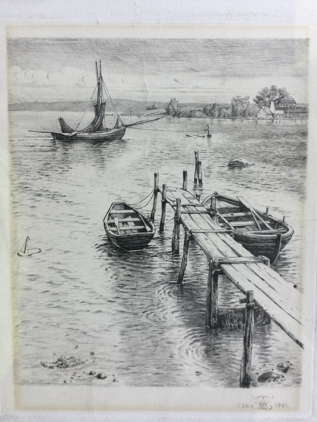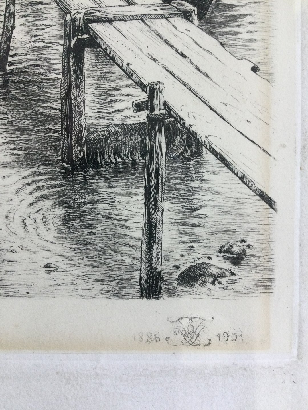 Radering af Peter Tom-Petersen - Badebroen, Troense 1901.