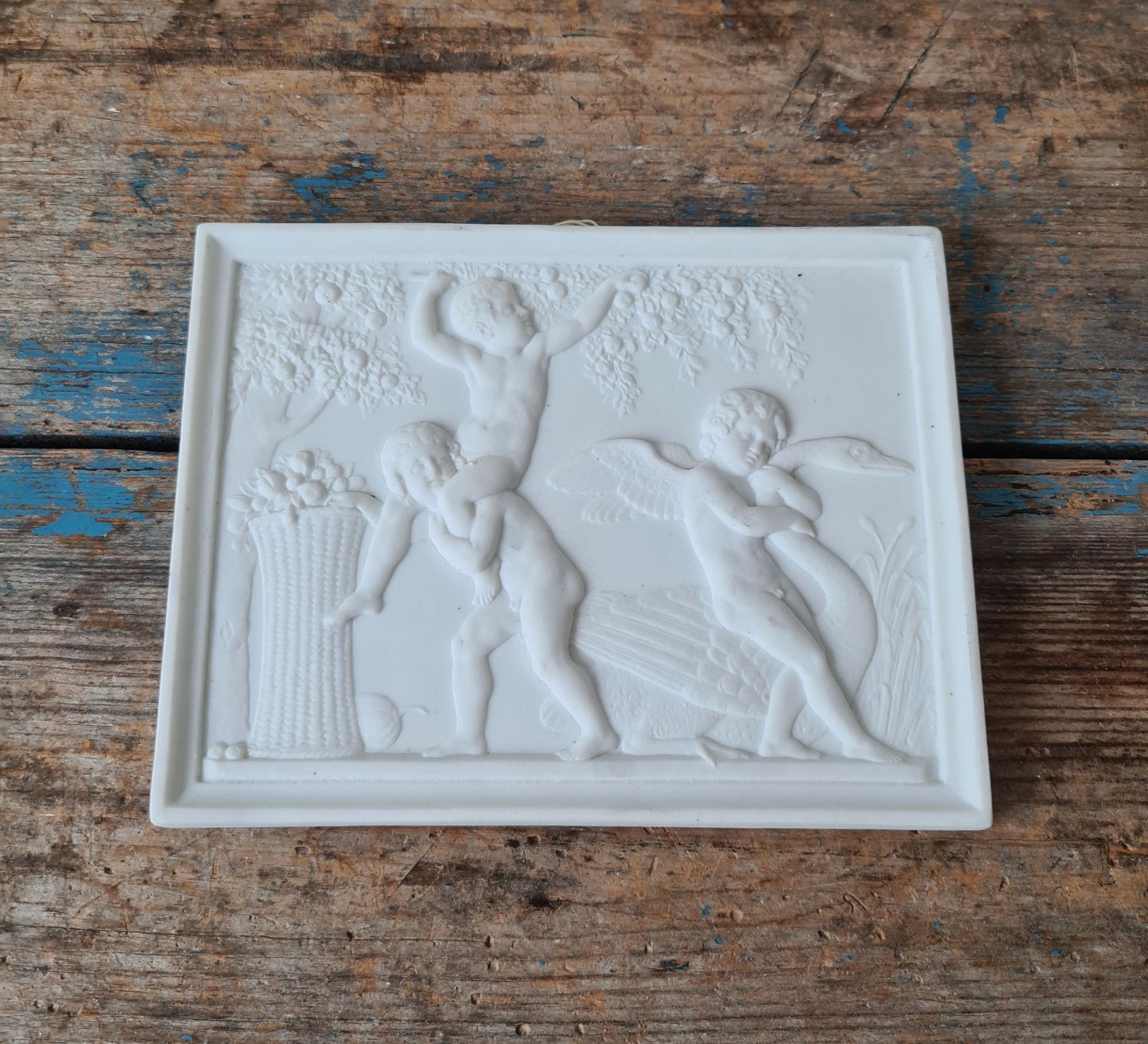 Bing & Grøndahl Bisque Platte Amor med svane og drenge der plukker frugt (Sommer) kopi fra 1862 efter Thorvaldsens originale i Rom 1811