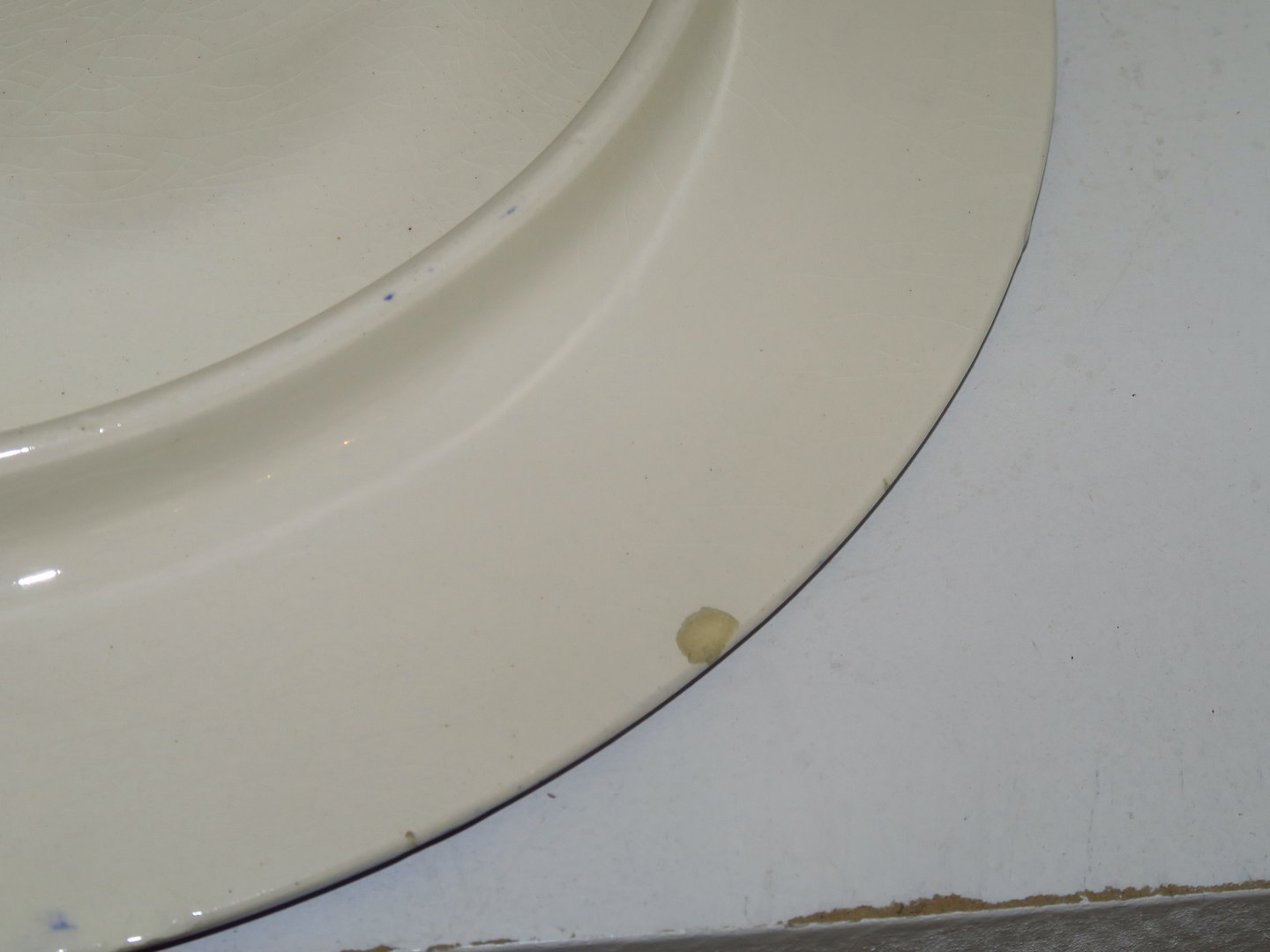 Der er et enkelt skår, som kun ses på bagsiden af platten - se fotos. Ellers perfekt stand uden fejl.