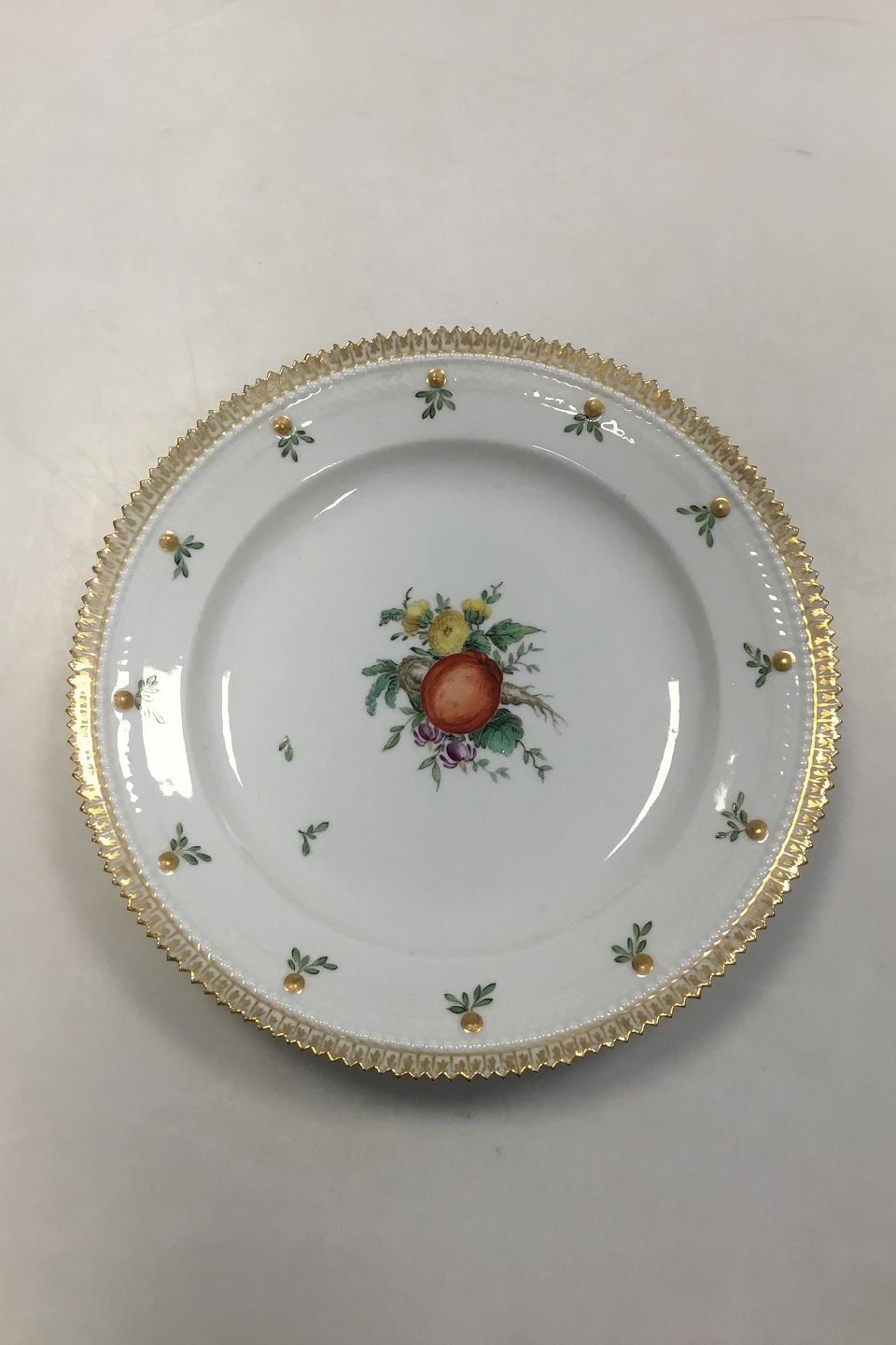 Frokosttallerken No 17/3550. Dekoreret med frugter/grøntsager i overglasur og guldkant. Måler 22 cm(8 21/32 in.)