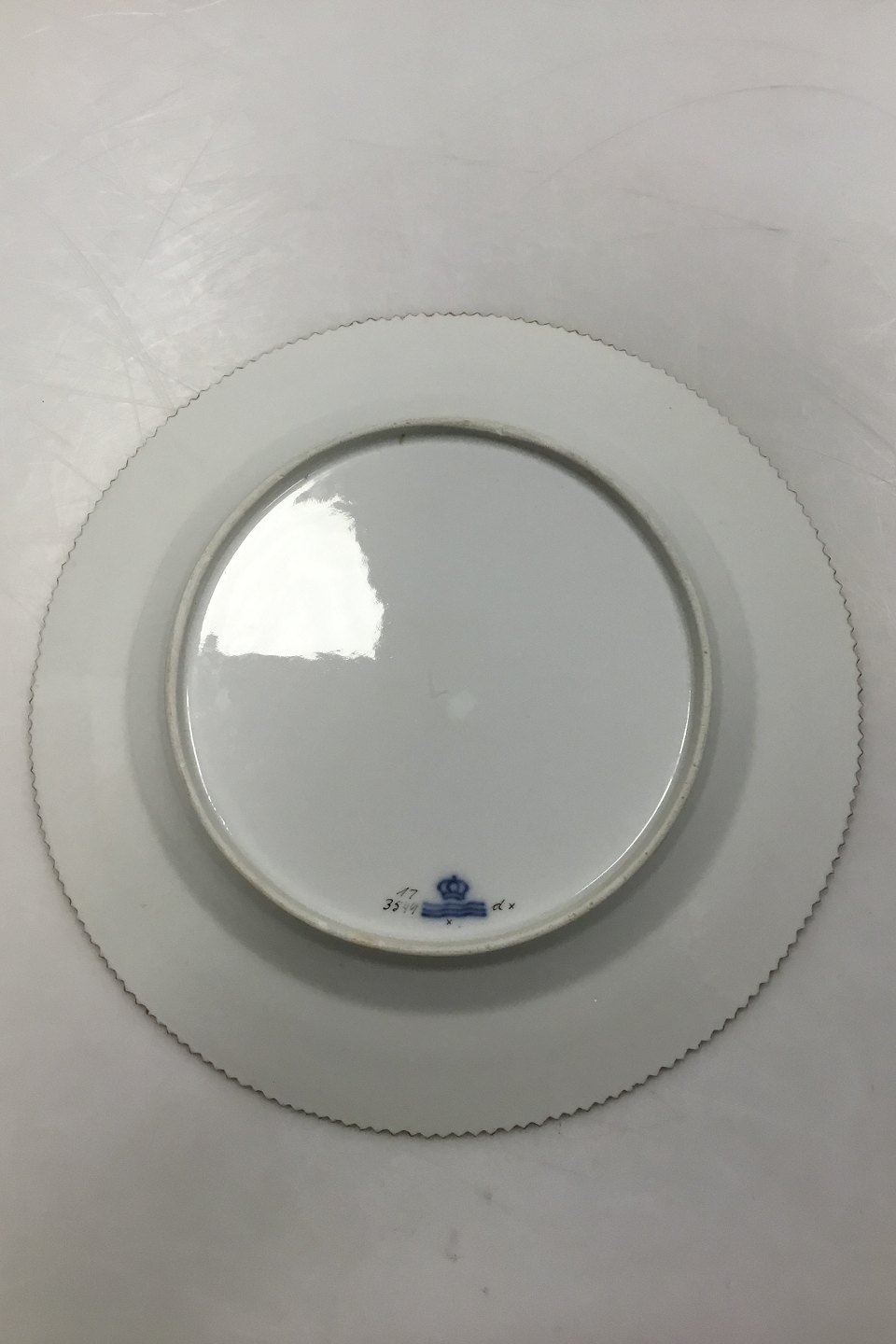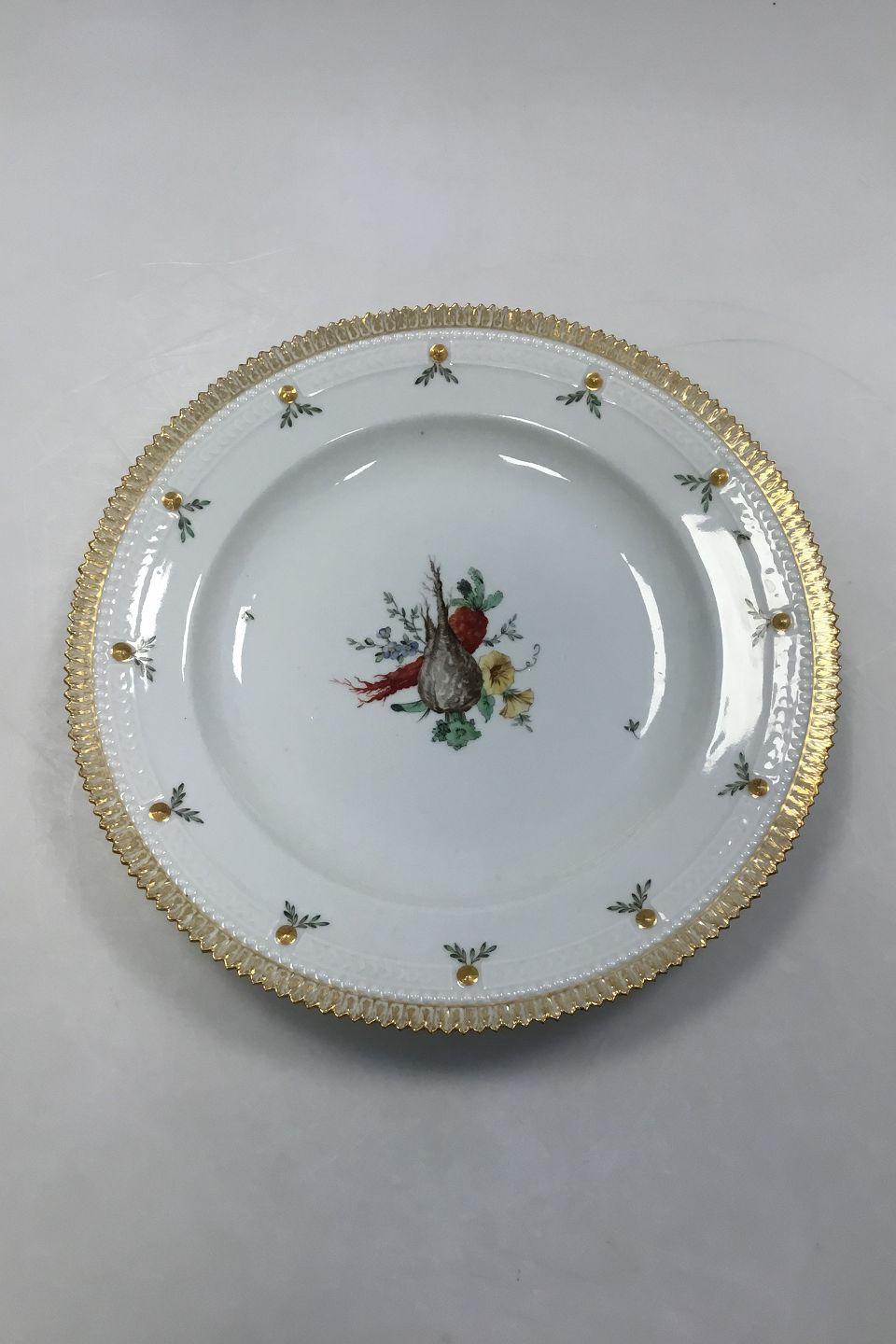 Middagstallerken No 17/3549. Dekoreret med frugter i overglasur og guldkant. Måler 25cm (9 27/32 in.)