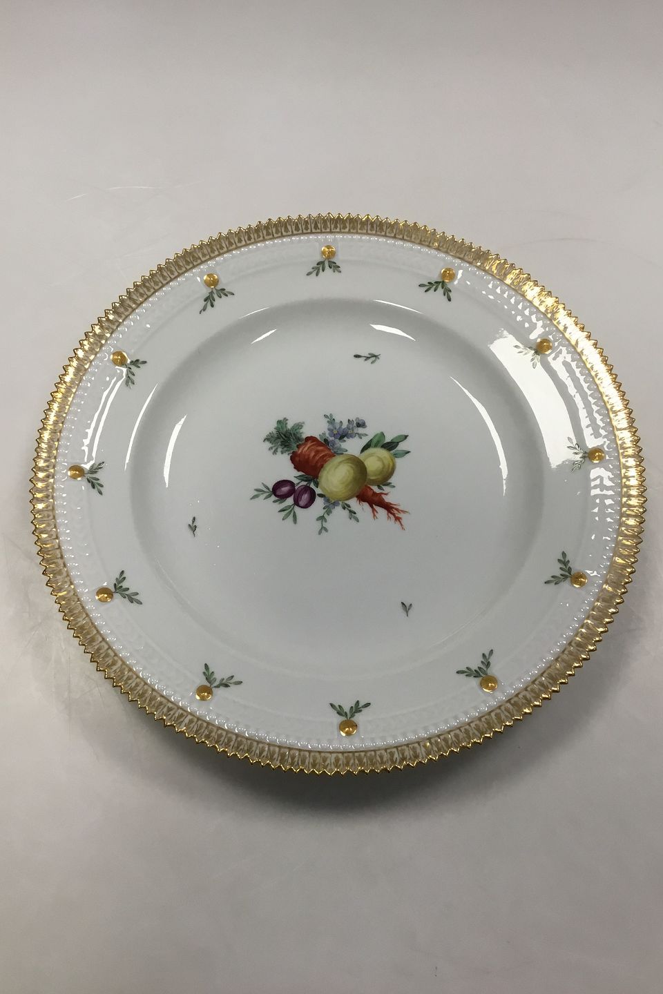 Middagstallerken No 17/3549. Dekoreret med frugter i overglasur og guldkant. Måler 25cm (9 27/32 in.)