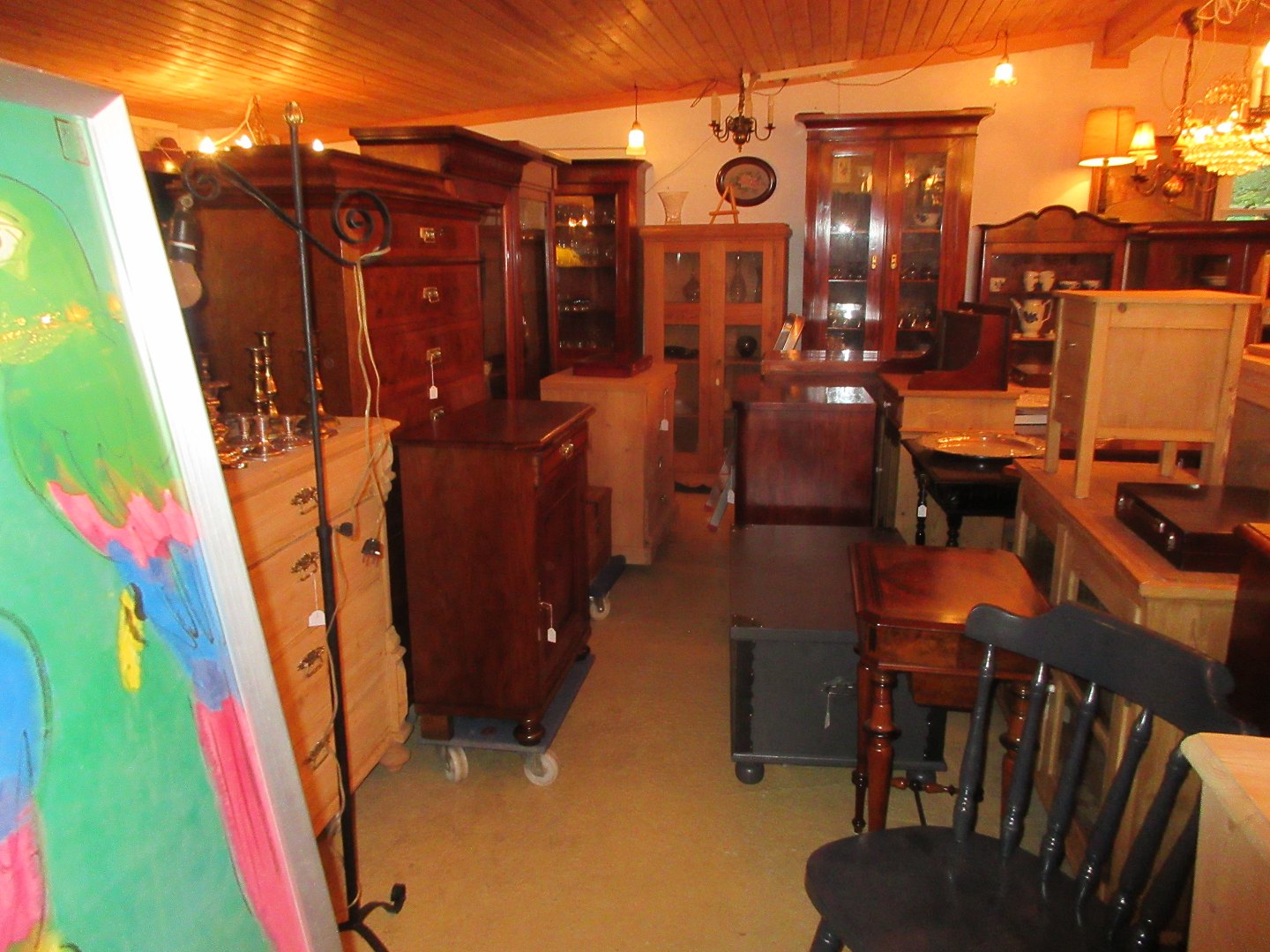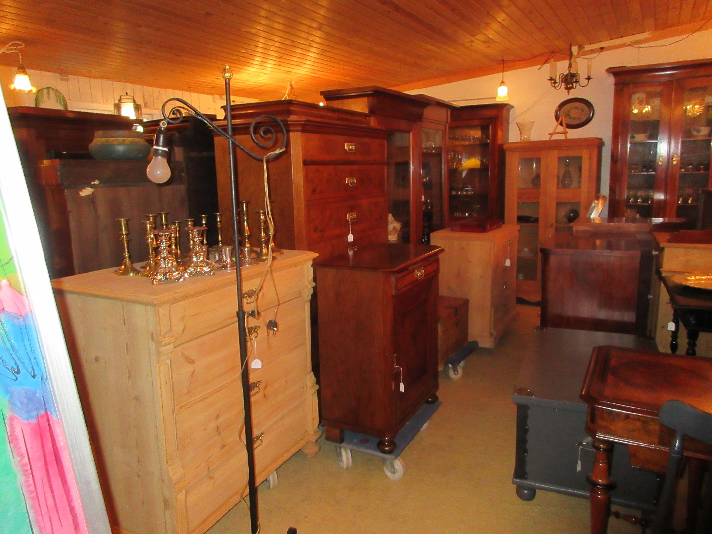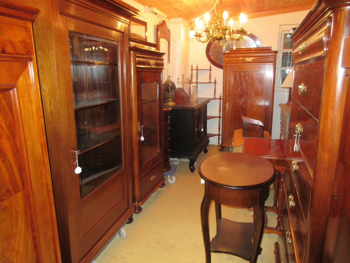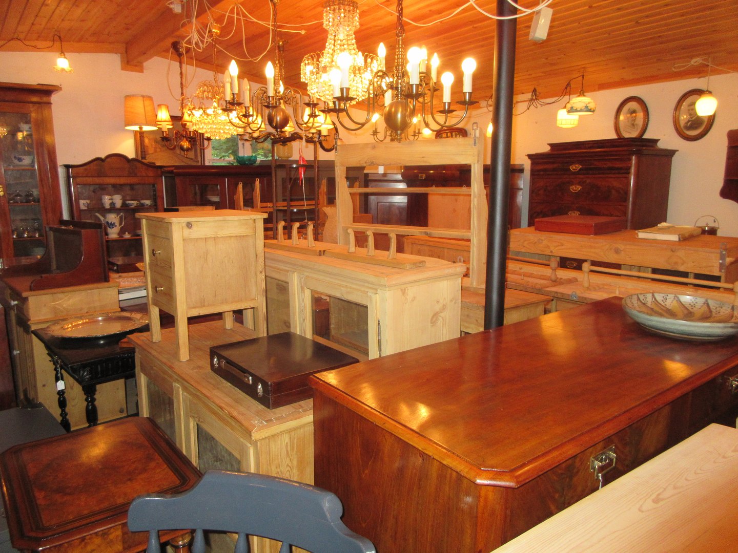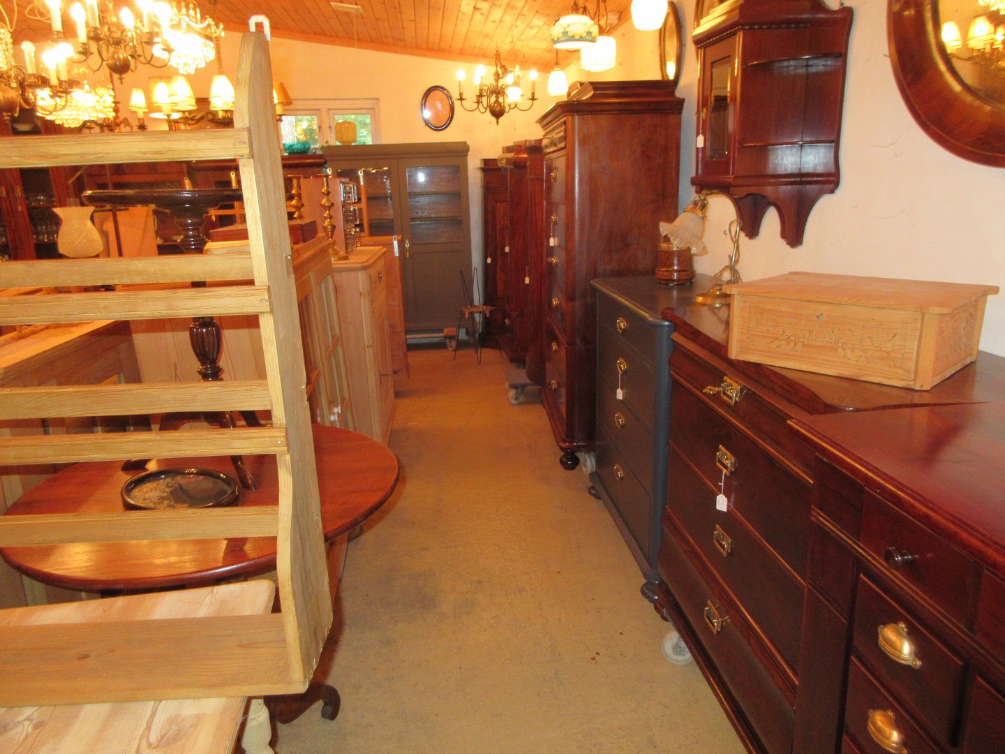 Stor salgsudstilling med restaurerede møbler håndpolerede mahognimøbler, afsyrede fyrretræsmøbler, malede træmøbler, kun originale gamle og antikke møbler.