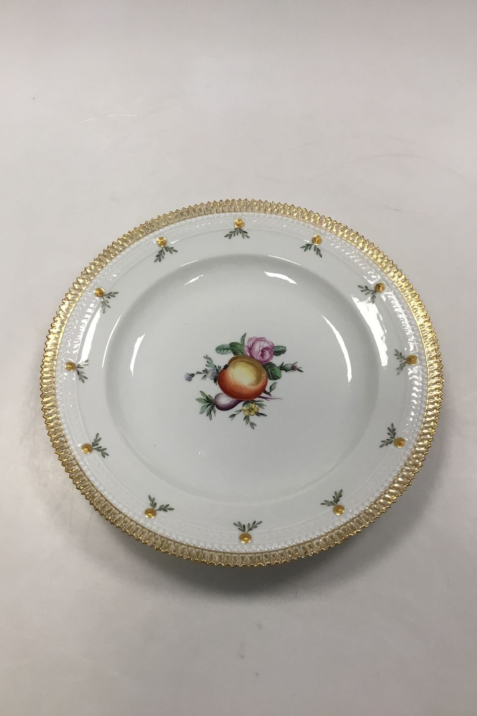 Middagstallerken No 17/3549. Dekoreret med frugter i overglasur og guldkant. Måler 25cm (9 27/32 in.) 2.Sortering med skår i guldkanten.