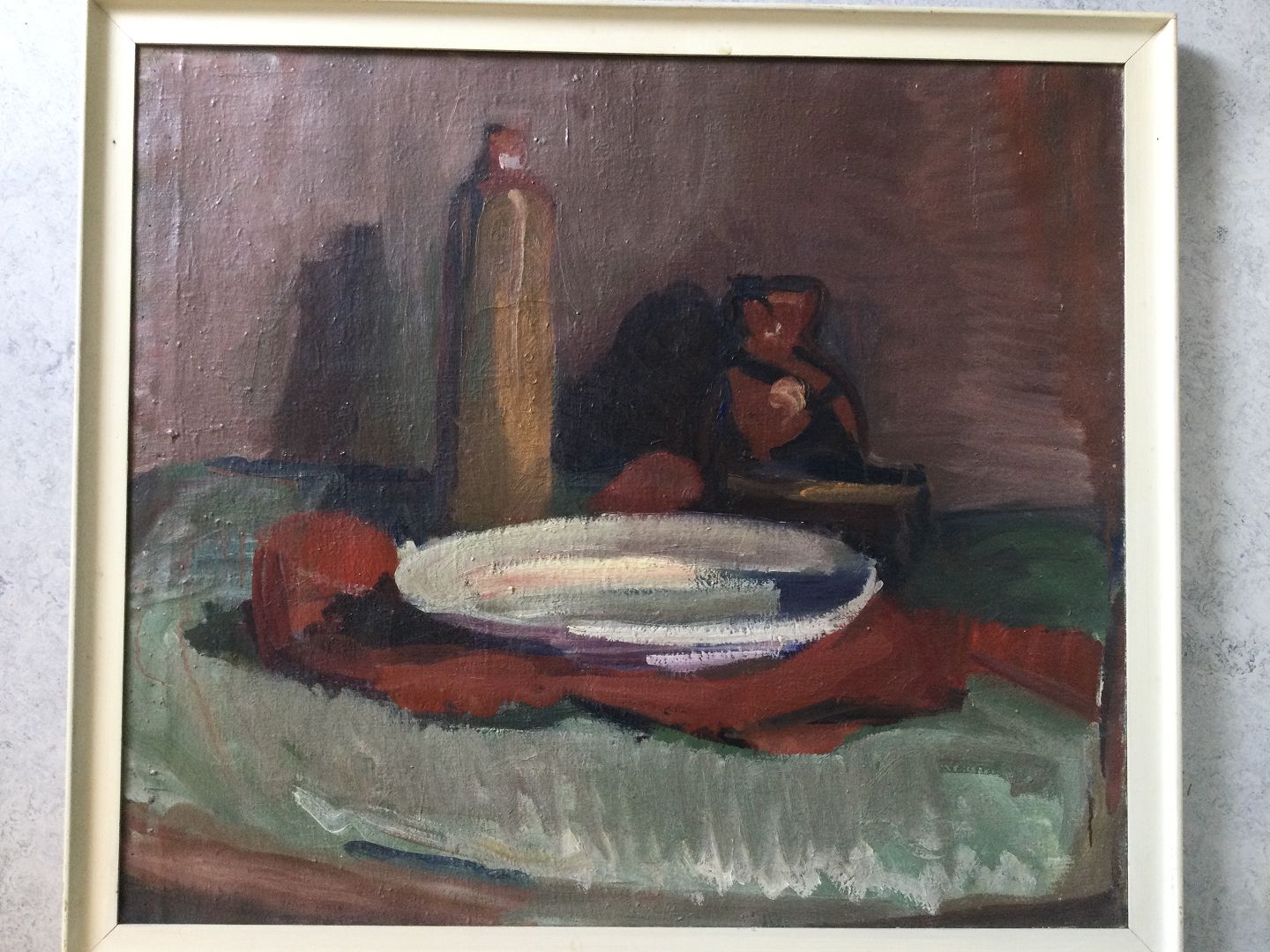 Maleri af Laurits Larsen - Opstilling med fad og krukker på bord.