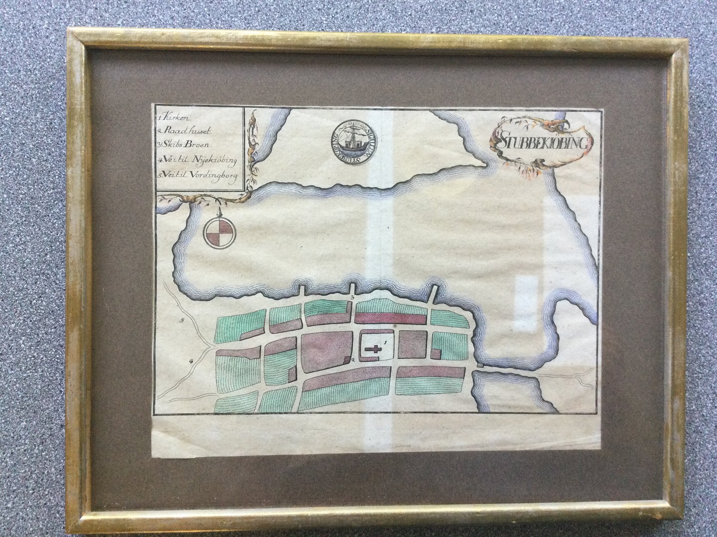 Gammelt koloreret kobberstik af Erik Pontoppidan - Kort over Stubbekøbing - fra Danske Atlas 1767.