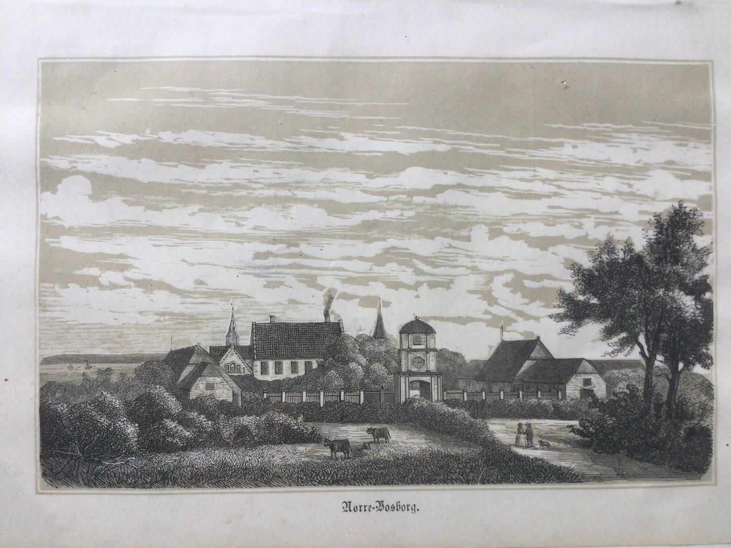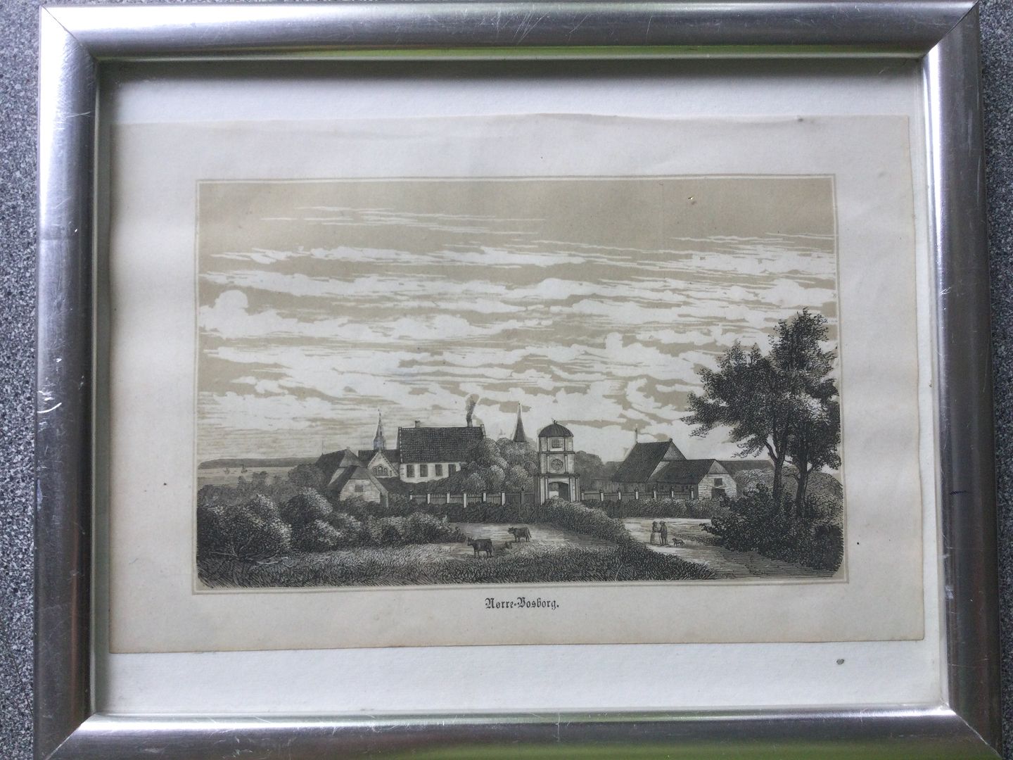 Litografi af Nørre Vosborg i Vestjylland ca. 1850.