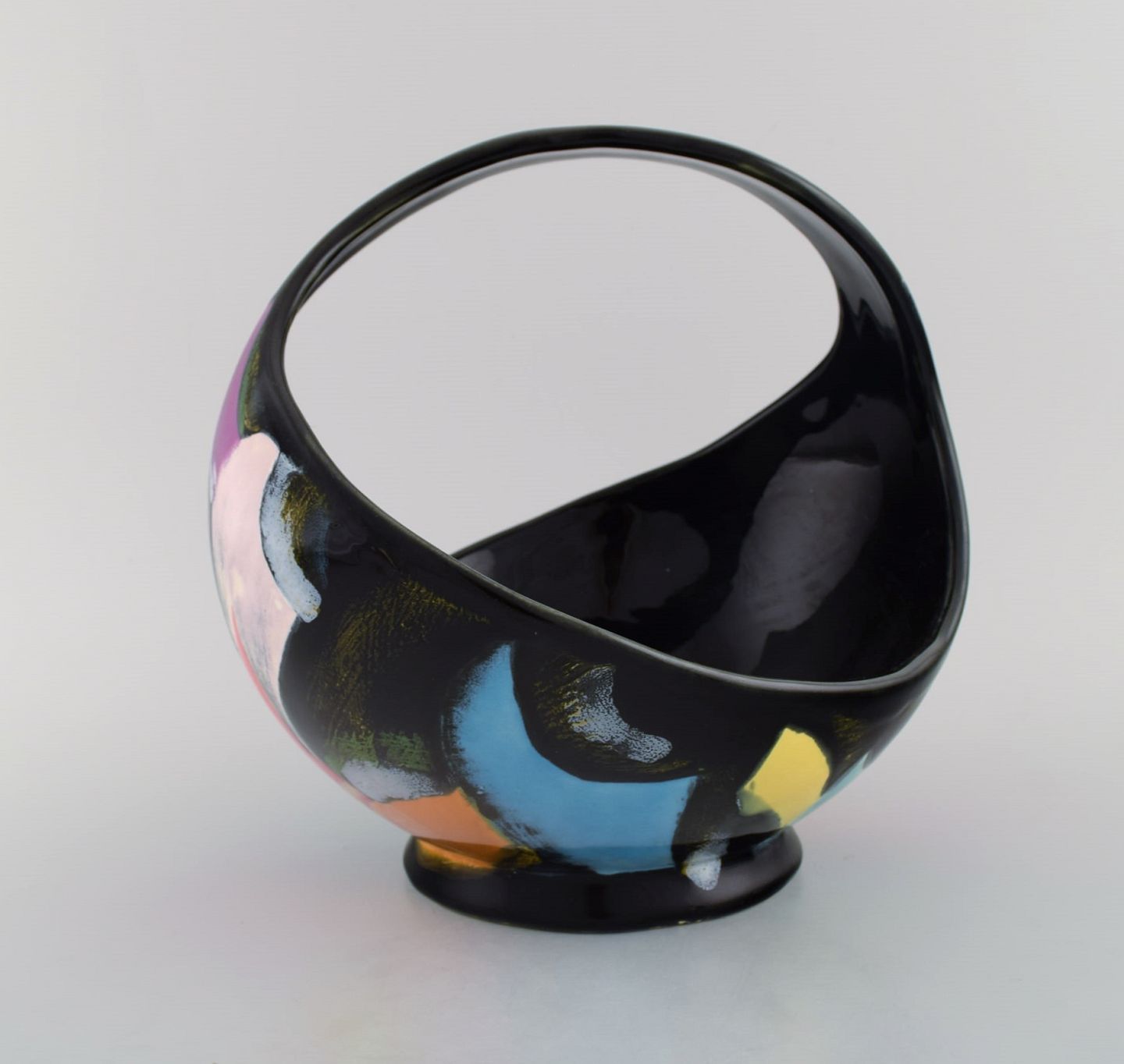 Longwy, Frankrig. Equinoxe kurv i glaseret keramik. Abstrakt polykrom dekoration på sort baggrund. Midt 1900-tallet.