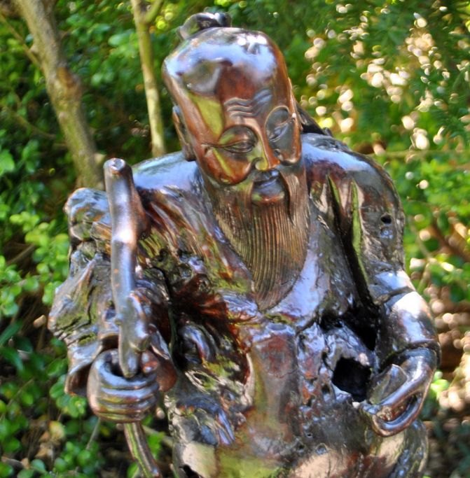Kinesisk rodtræ figur af vismand med stok, ca. 1900.