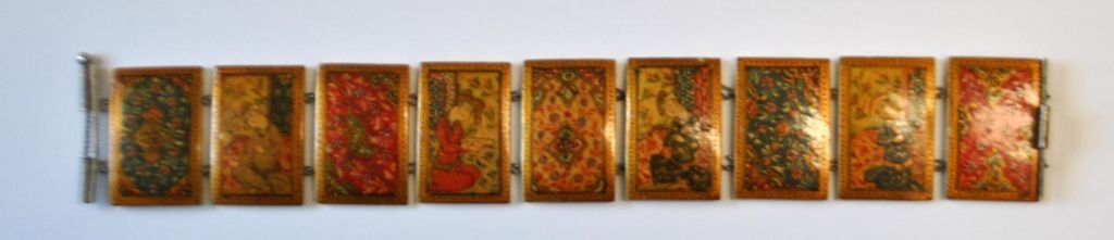 Persisk armbånd, 20. årh. Benstykker med polyrkome håndbemalede scener af siddende mænd og geometriske mønstre. L.: 18 cm. H: 2,8 cm.