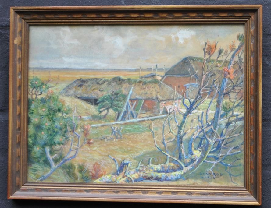 Nyrop, Børge (1881 - 1948) Danmark: En gård ved Vesterhavet. Akvarel/pastel på papir. Signeret 1926. 25 x 35 cm. Indrammet: 31 x 40 cm.