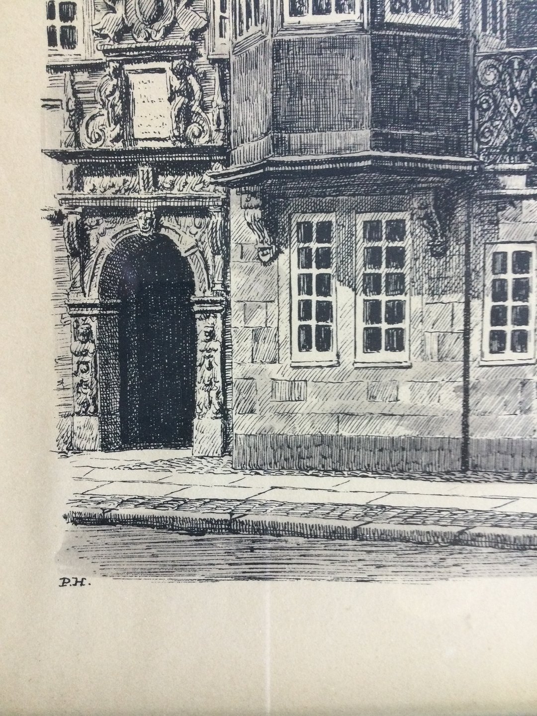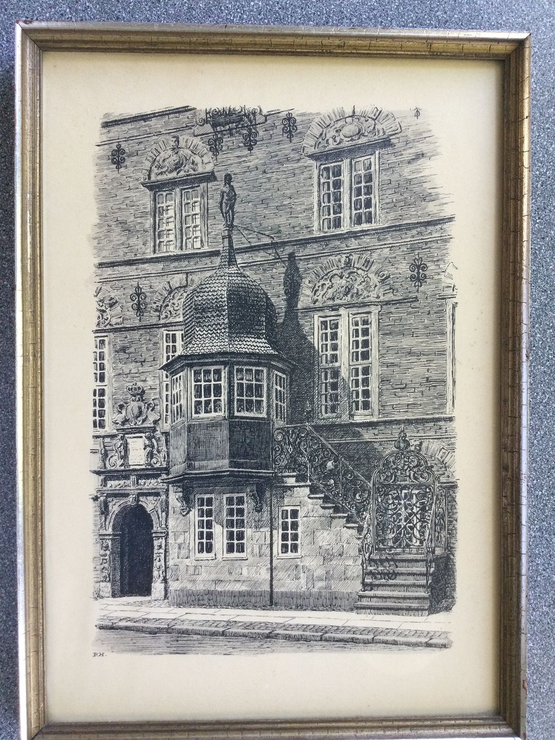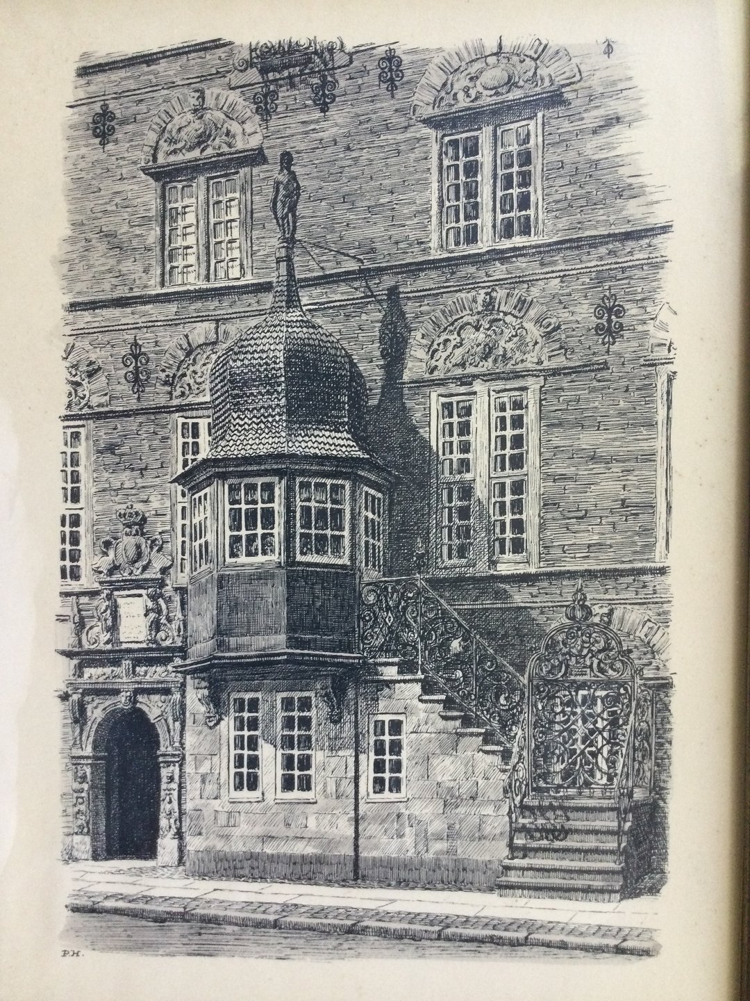 Text available in Danish: Radering af Peter Holm - Indgangsparti og tårn på Jens Bangs Stenhus, Østeraa, Aalborg