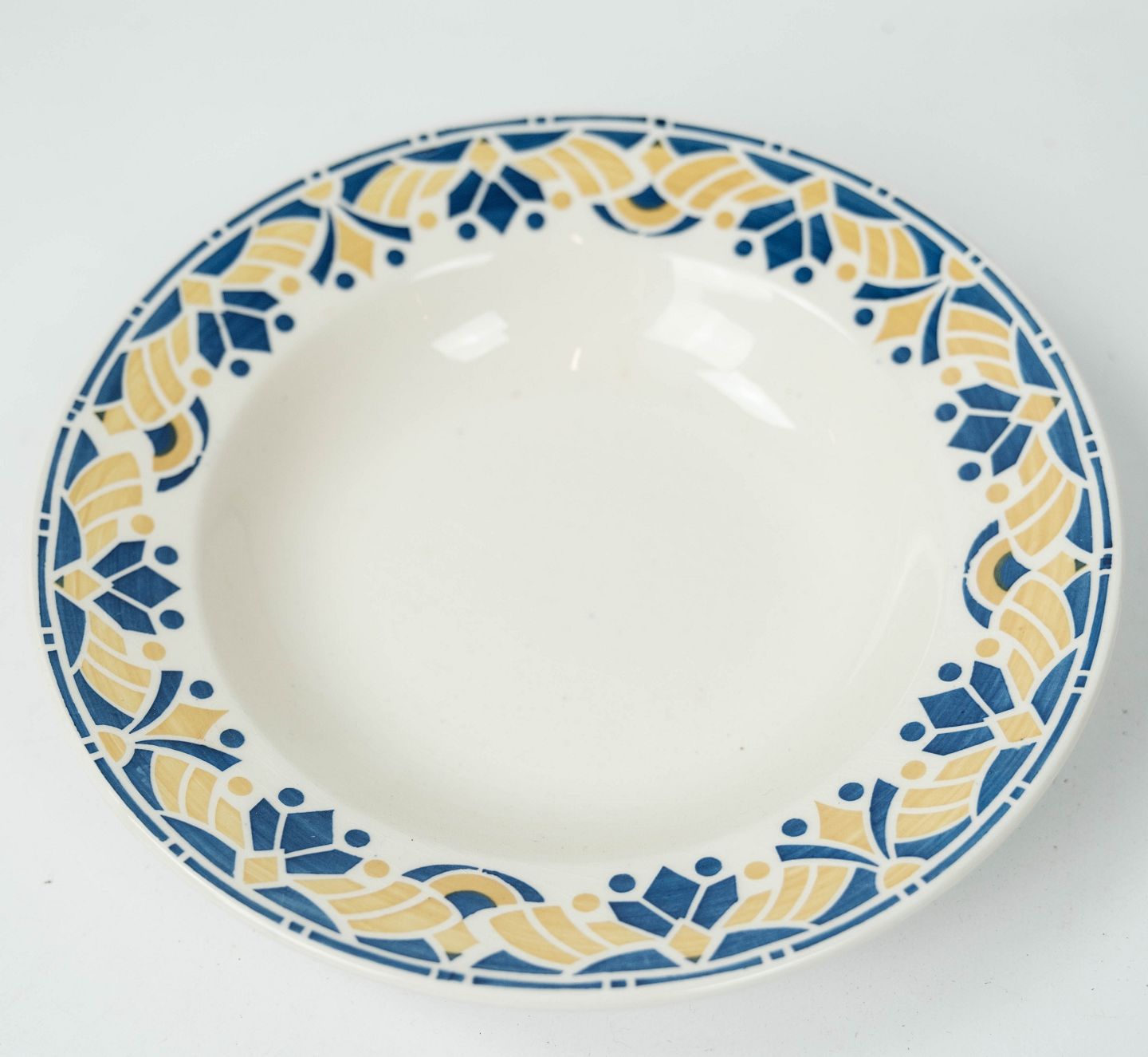Deep dinner plate decorated with blue and yellow colours from the 1960s. We have 11 in stock.