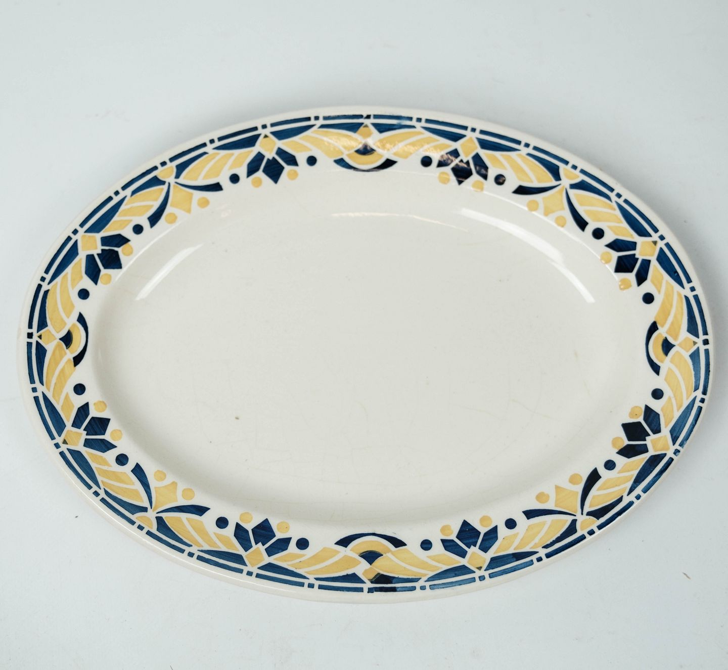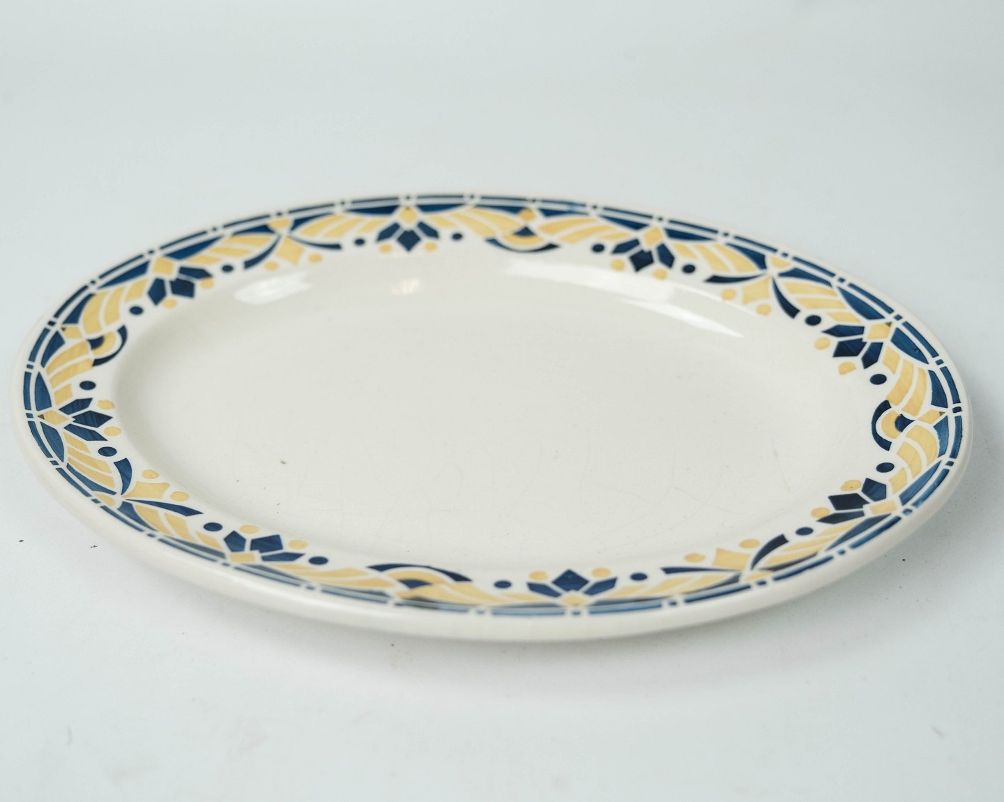 Stor middagstallerken dekoreret med gule og blå farver fra 1960erne.