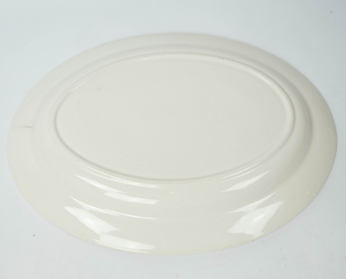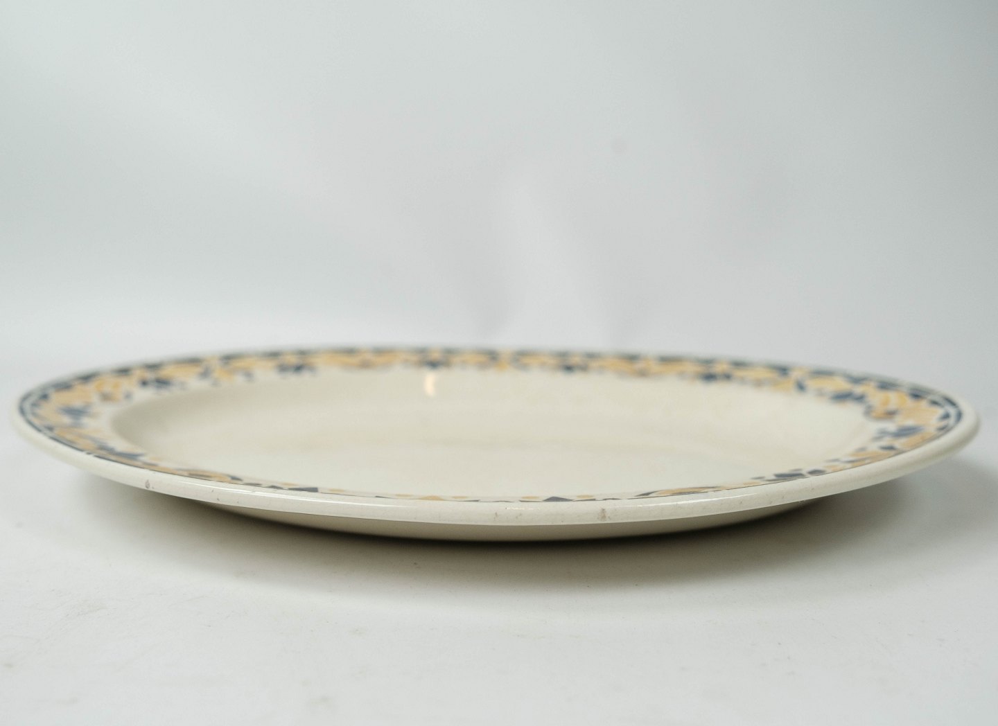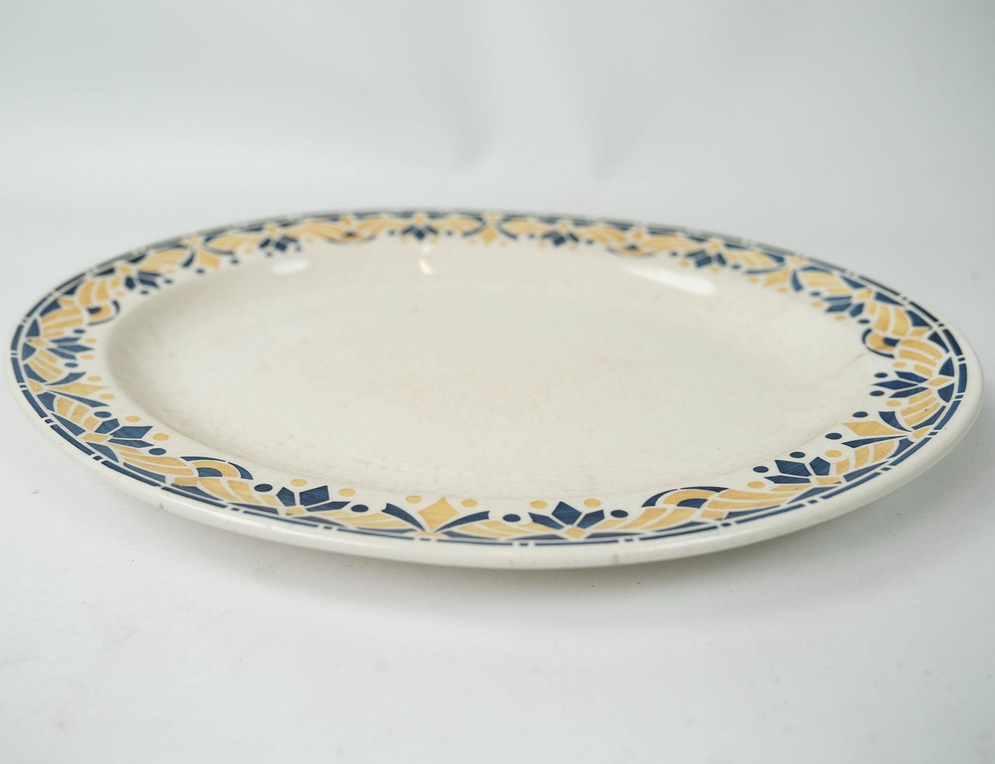 Rundt fad dekoreret med blå og gule farver fra 1960erne.