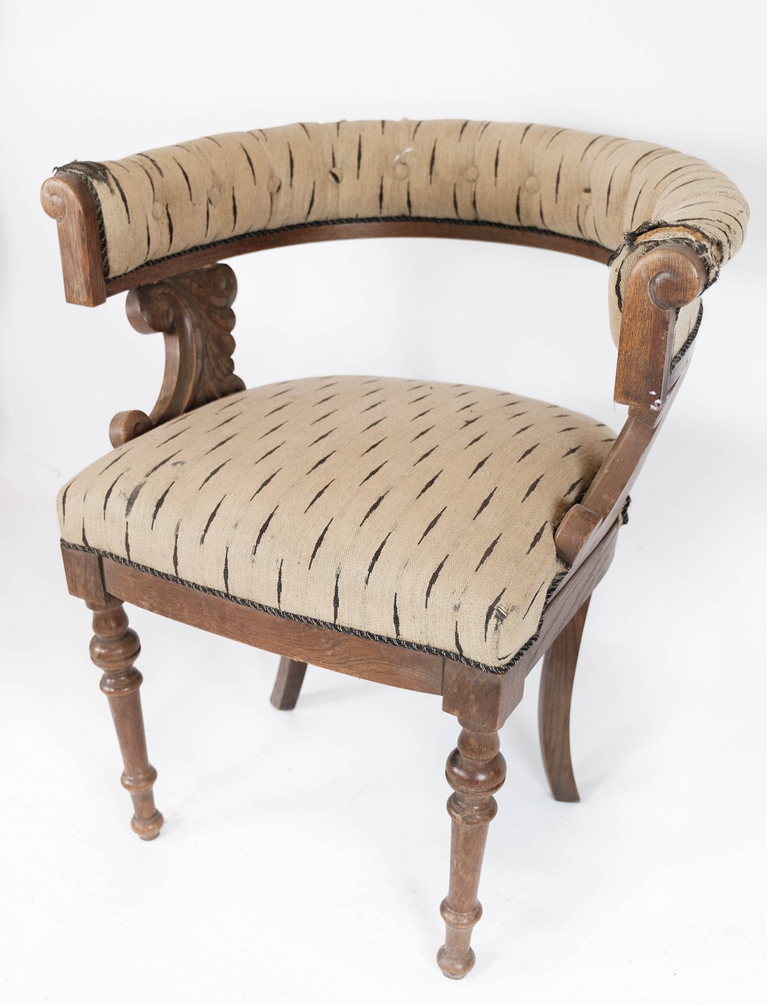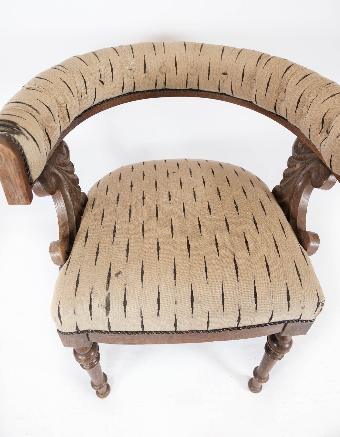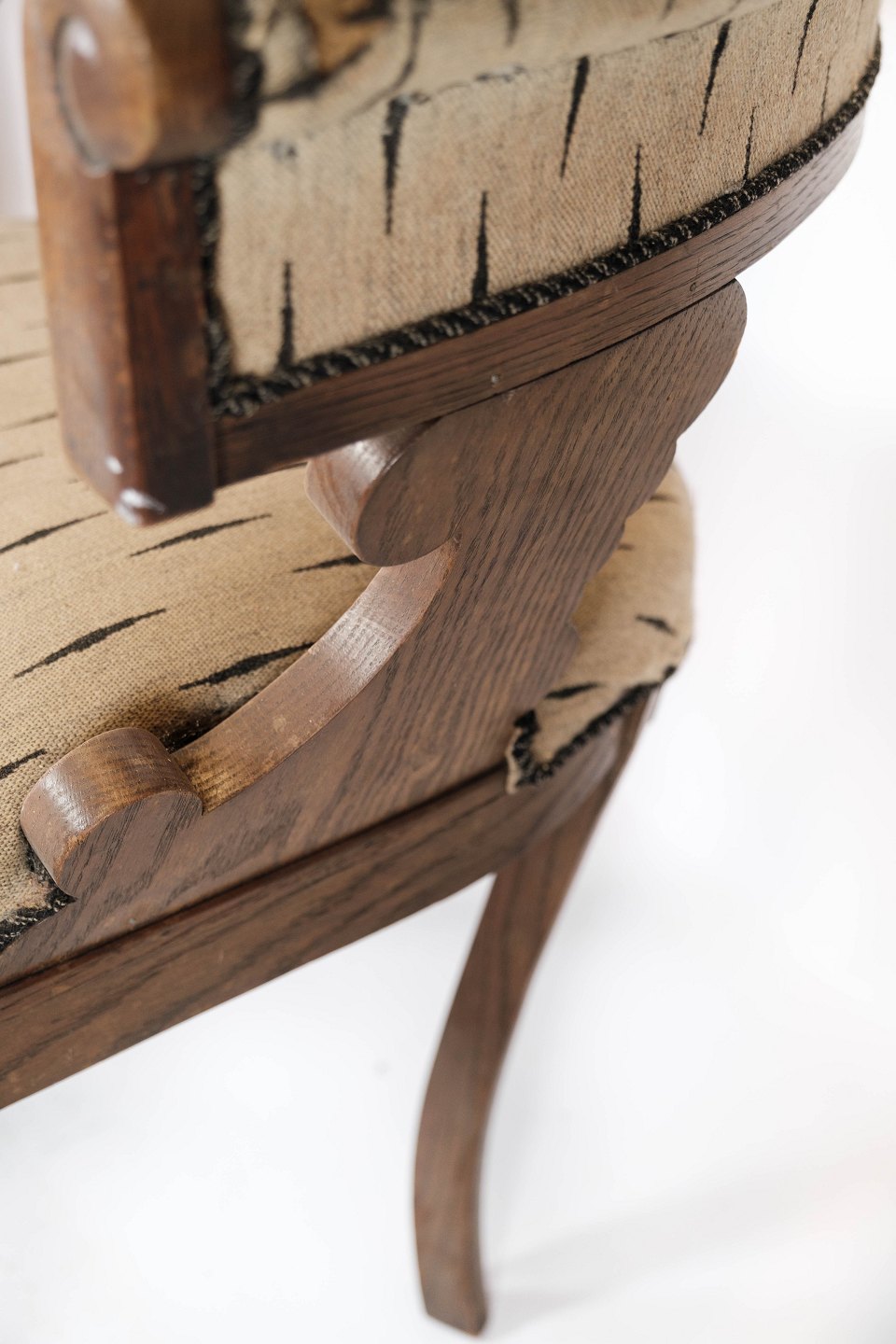Antik armstol af eg og med original polstring af lyst stof, fra 1920erne.